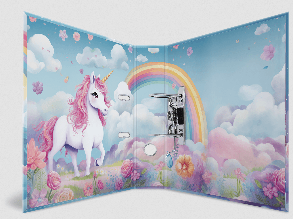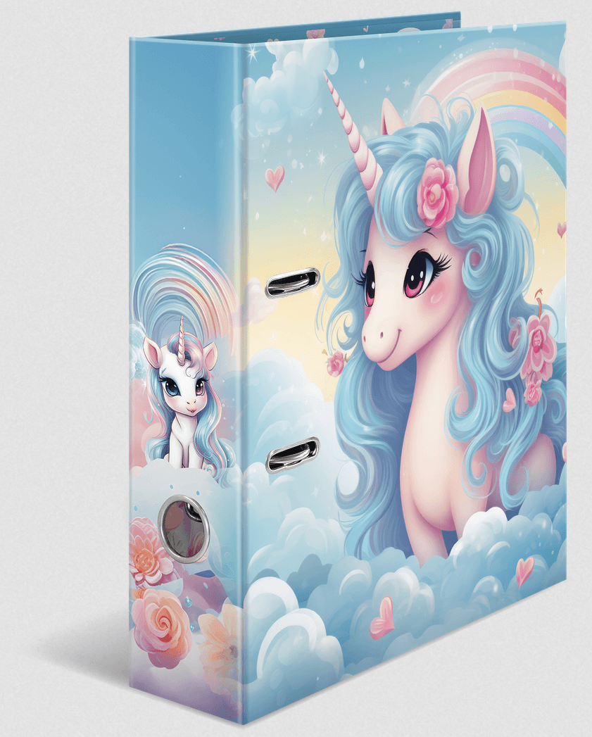 Eintauchen in die magische Welt der Happy Unicorns! Dieser hochwertige Motiv-Ordner aus stabilem Karton mit praktischer Ringmechanik ist der ideale Begleiter für alle Einhorn-Fans. Die fröhlichen Einhörner mit großen, strahlenden Augen und weichem, hellblauem Fell bringen jedes Gesicht zum Strahlen. Der Hintergrund, verziert mit bunten Wolken, Herzen, Blüten und Regenbögen, verleiht jedem Kinderzimmer oder Schulranzen einen Hauch von Magie. Dieser Einhorn-Ordner ist perfekt für kleine Prinzessinnen und Prinzen, die Wert auf Stil und Ordnung legen. Ein Muss für alle, die ihre Schulunterlagen oder wichtigen Dokumente fantasievoll und ordentlich aufbewahren möchten!