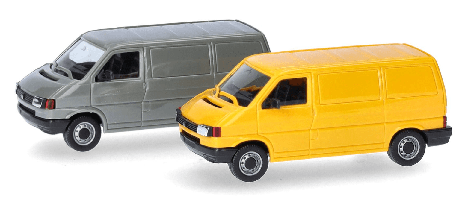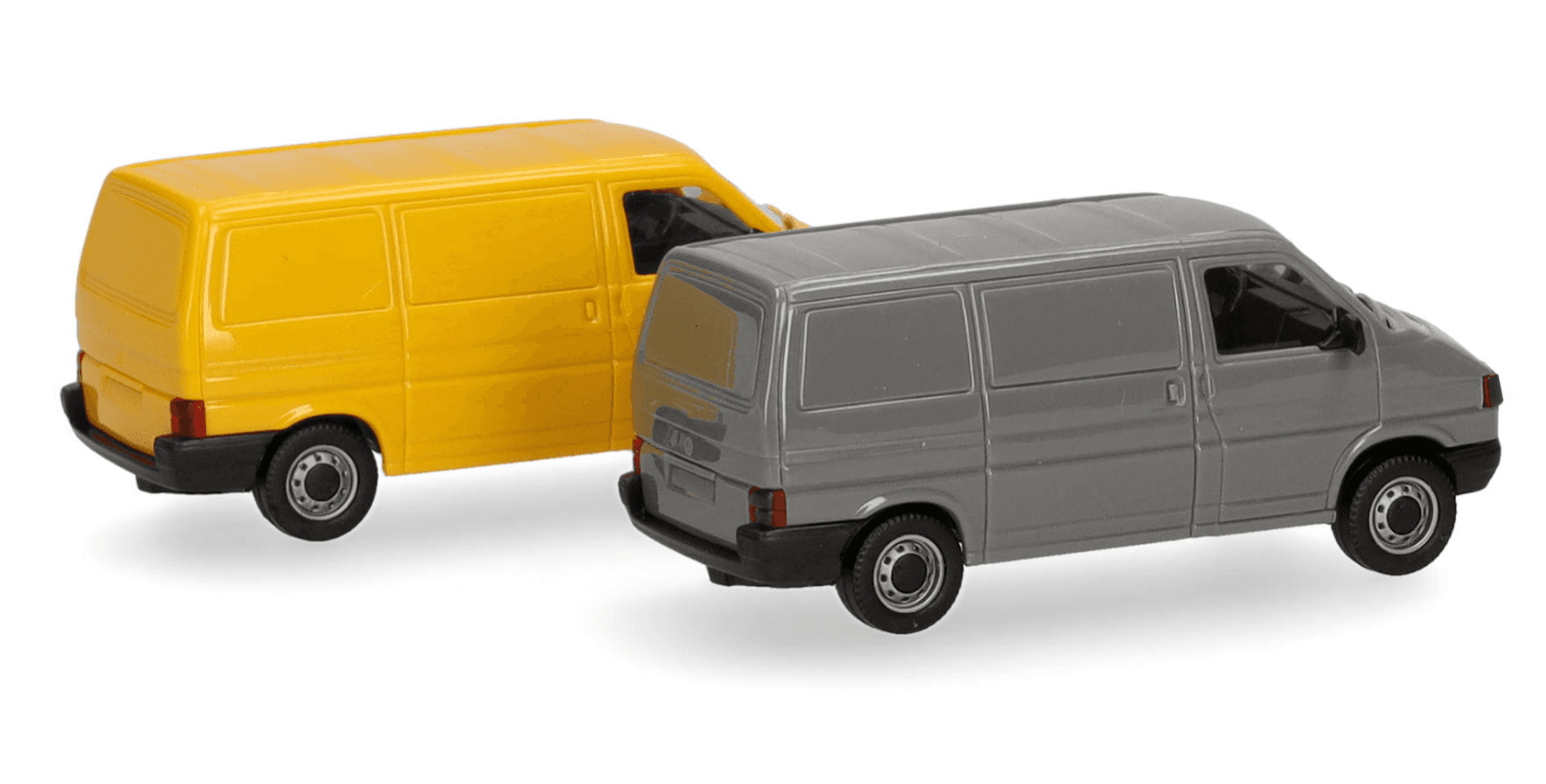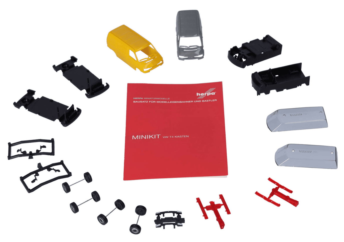 Ein sehr beliebtes Modell im MiniKit-Sortiment ist der VW T4 Kasten. Mit Ginstergelb (Post) und Grau (in Grundierung) erscheinen zwei Farben, die immer noch auf den Straßen unterwegs sind.