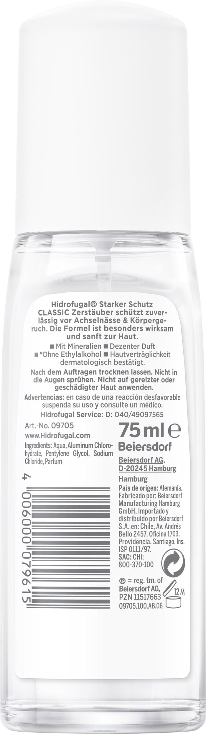 Besonders wirksam und sanft zur Haut: Der HIDROFUGAL CLASSIC Zerstäuber 75ml schützt zuverlässig gegen Achselnässe und unangenehmen Körpergeruch. Die spezielle Formulierung des Anti-Transpirant Deo-Zerstäubers sorgt für einen starken Schutz, eine angenehme einfache Anwendung und hinterlässt ein frisches Gefühl auf der Haut. Dank seiner handlichen Größe ist der Zerstäuber der ideale Begleiter für unterwegs, um ein frisches Gefühl unter den Achseln den ganzen Tag genießen zu können. Sein dezenter Duft ermöglicht außerdem eine Kombination mit jedem beliebigen Parfüm deiner Wahl. HIDROFUGAL CLASSIC Zerstäuber bietet einen langanhaltenden Schutz und Frische den ganzen Tag über und das ohne Ethylalkohol. Die Hautverträglichkeit ist dermatologisch getestet.