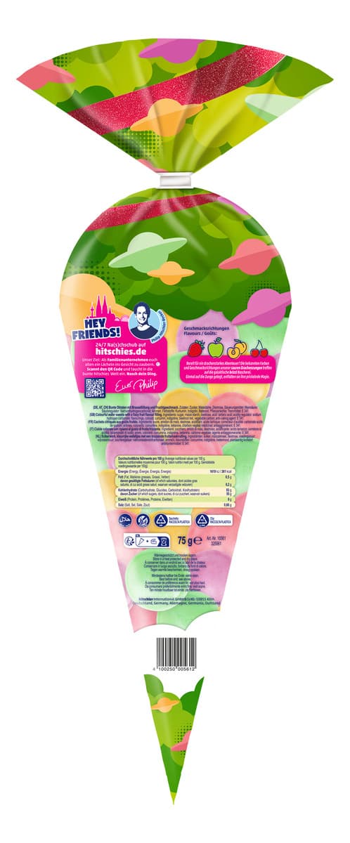 | Zutaten | Zucker, Maisstärke, Wasser, Dextrose, Säuerungsmittel: Weinsäure; Säureregulator: Natriumhydrogencarbonat; Aromen, Farbstoffe: Kurkumin, Indigotin, Betenrot, Pflanzenkohle; Trennmittel: E 341. |