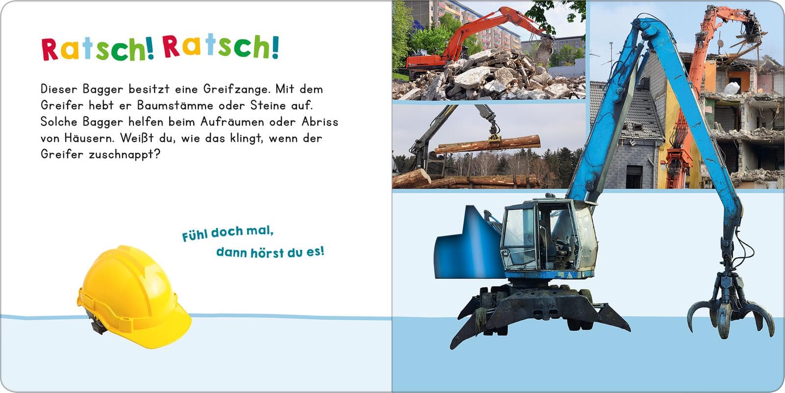 Auf jeder Doppelseite wird eine Baggerszene mit anschaulichen Fotos und einem kurzen Sachtext vorgestellt. Das Fühlelement lädt zum Entdecken ein und beim Darüberstreichen wird das passende Baggergeräusch ausgelöst. Das ist nicht nur spannend, sondern fördert auch die Hand-Auge-Koordination, die Lautbildung und das Sprechen. Die hochwertigen Baustellenfotos sorgen für ein schnelles Erkennen. Das Fühlbuch mit Sound eignet sich für Kinder ab 6 Monaten.