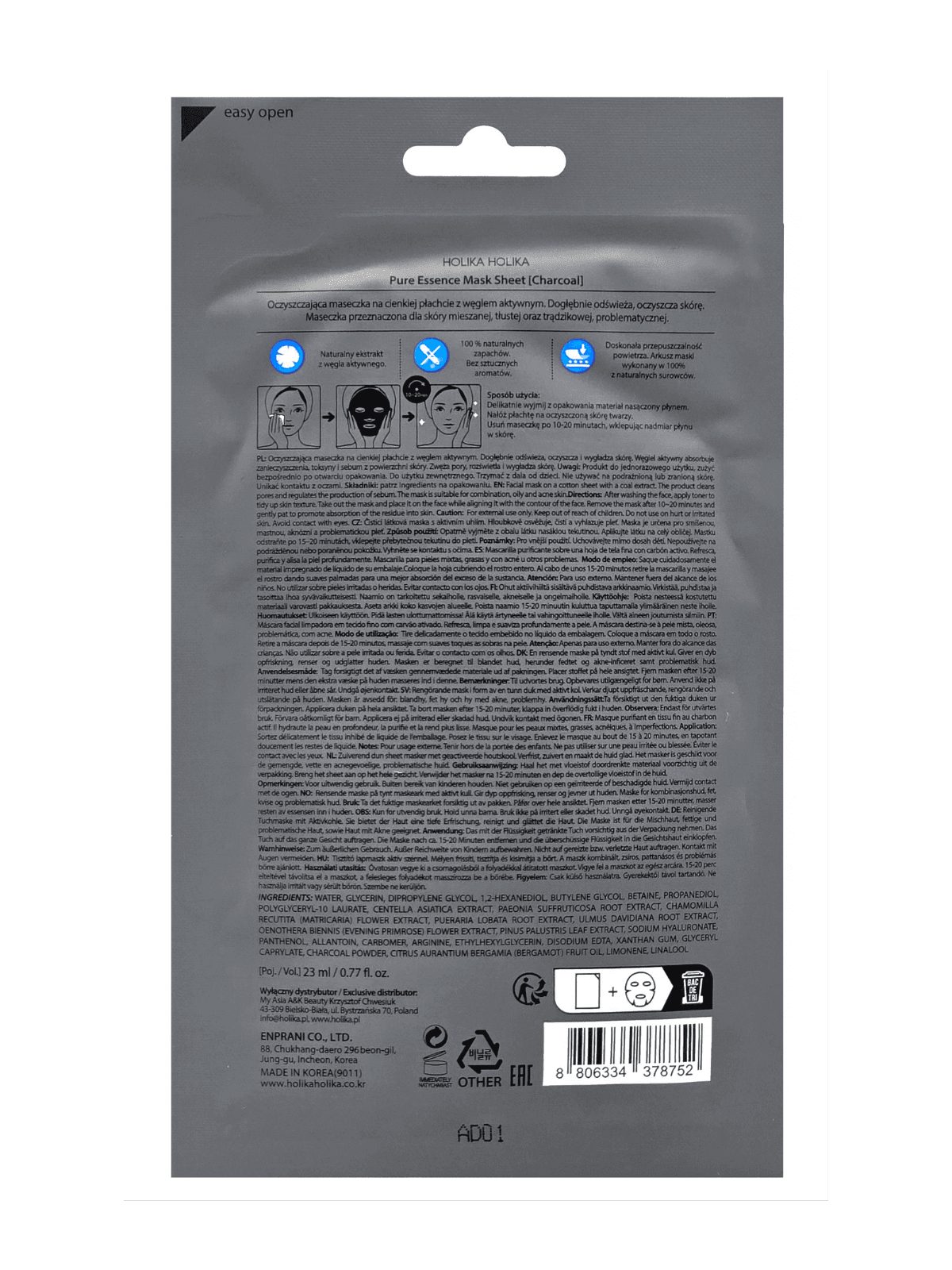 Die HOLIKA HOLIKA Pure Essence Mask Sheet - Charcoal mit Aktivkohle reinigt die Haut porentief und hilft, die Poren sichtbar zu verfeinern. Dank Tigergras wirkt sie entzündungshemmend und beruhigend, während die entgiftende Wirkung der Kohle überschüssigen Talg und Unreinheiten entfernt. Gleichzeitig wird die Haut mit Feuchtigkeit und wichtigen Vitaminen versorgt – für einen klareren, ebenmäßigeren und frischen Teint.