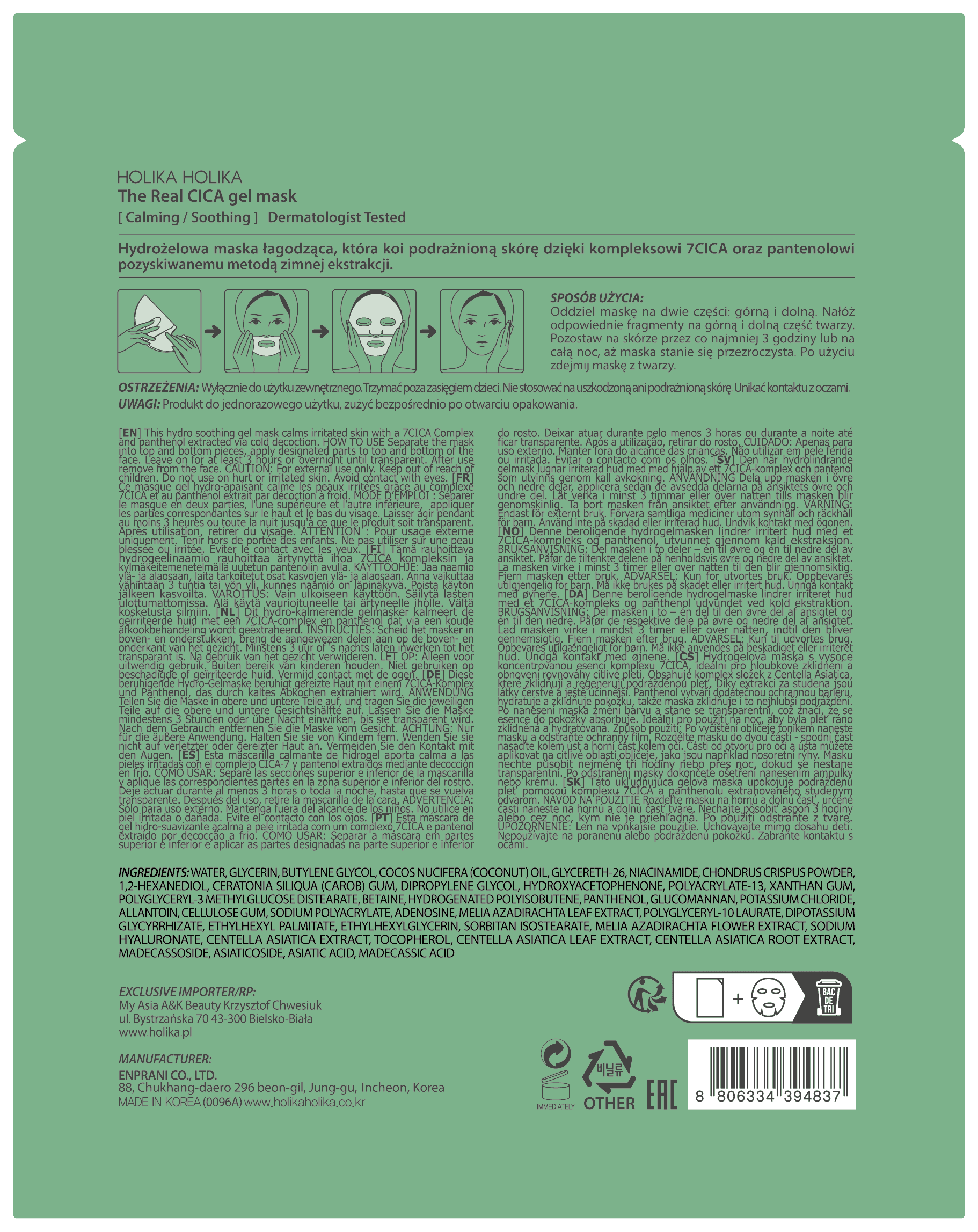 Die Hydrogel-Maske mit 7CICA-Komplex und Panthenol beruhigt empfindliche Haut, spendet intensiv Feuchtigkeit und unterstützt die Regeneration der Hautbarriere. Niacinamid gleicht den Hautton aus, Adenosin wirkt ersten Falten entgegen und Tocopherol schützt vor äußeren Umwelteinflüssen.