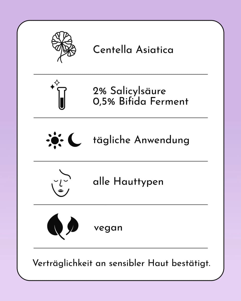 Unsere Hydrokolloid Pimple Buddy Patches sind die effektive Lösung für Unreinheiten. Sie wirken gezielt gegen Pickel, ganz ohne strapazierende Inhaltsstoffe oder Reizungen. Die Patches legen sich wie ein schützender Film über die betroffenen Stellen. Die Hydrokolloid Patches mit 2 % Salicylsäure und Centella Asiatica trocknen Unreinheiten sanft aus, beruhigen die Haut und reduzieren Rötungen sichtbar. Gleichzeitig schützen die Patches die Haut vor äußeren Einflüssen. Die Patches sind mehr als Pflege, sie sind Teil deines Looks. Ihre leichte, kaum spürbare Textur macht sie zum idealen Begleiter, tagsüber oder über Nacht. Für klare, beruhigte Haut, ganz ohne Aufwand. - 83 % bestätigen, dass das Produkt Pickel austrocknet* - 76 % bestätigen, dass das Produkt Rötungen reduziert* - 80 % bestätigen, dass das Produkt irritierte Haut vor Wasser, Schmutz und Bakterien schützt* *Studie, 30 Proband: innen, Selbsteinschätzung nach 10 Stunden bei einmaliger Anwendung