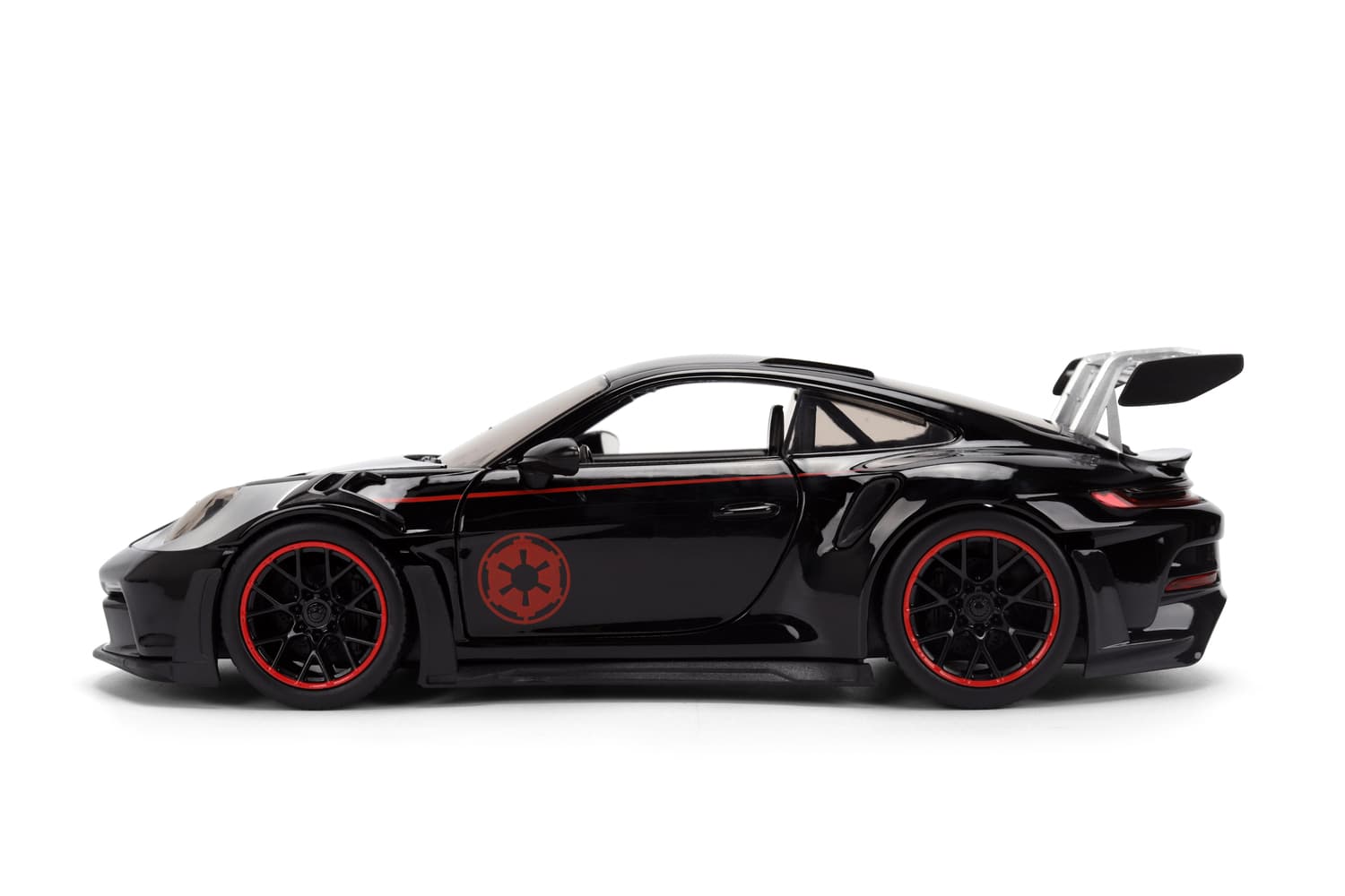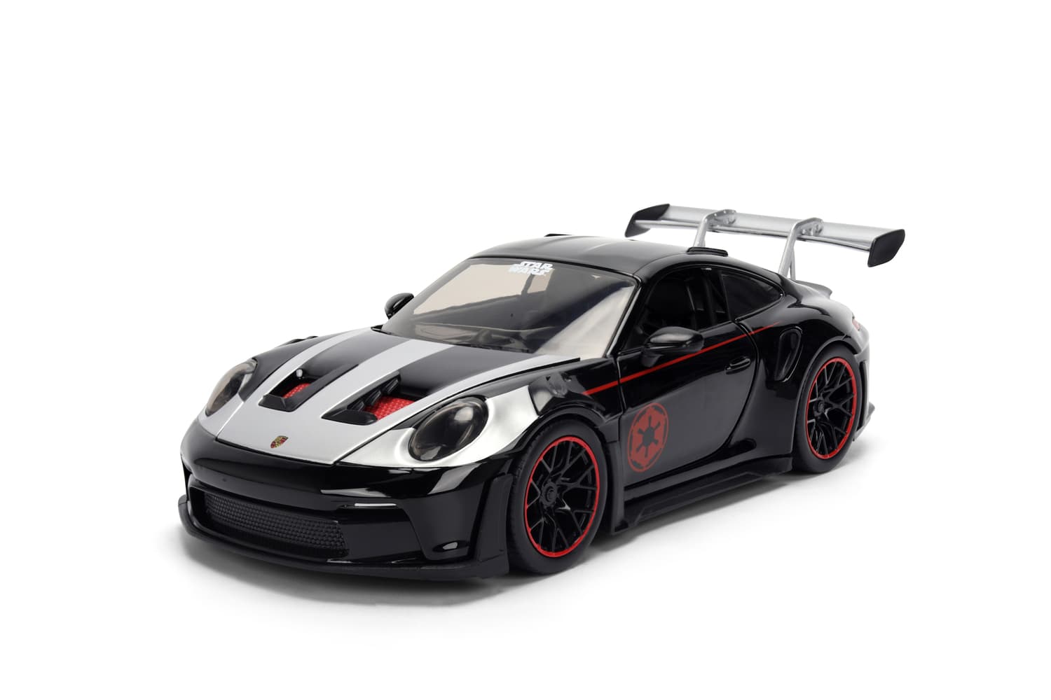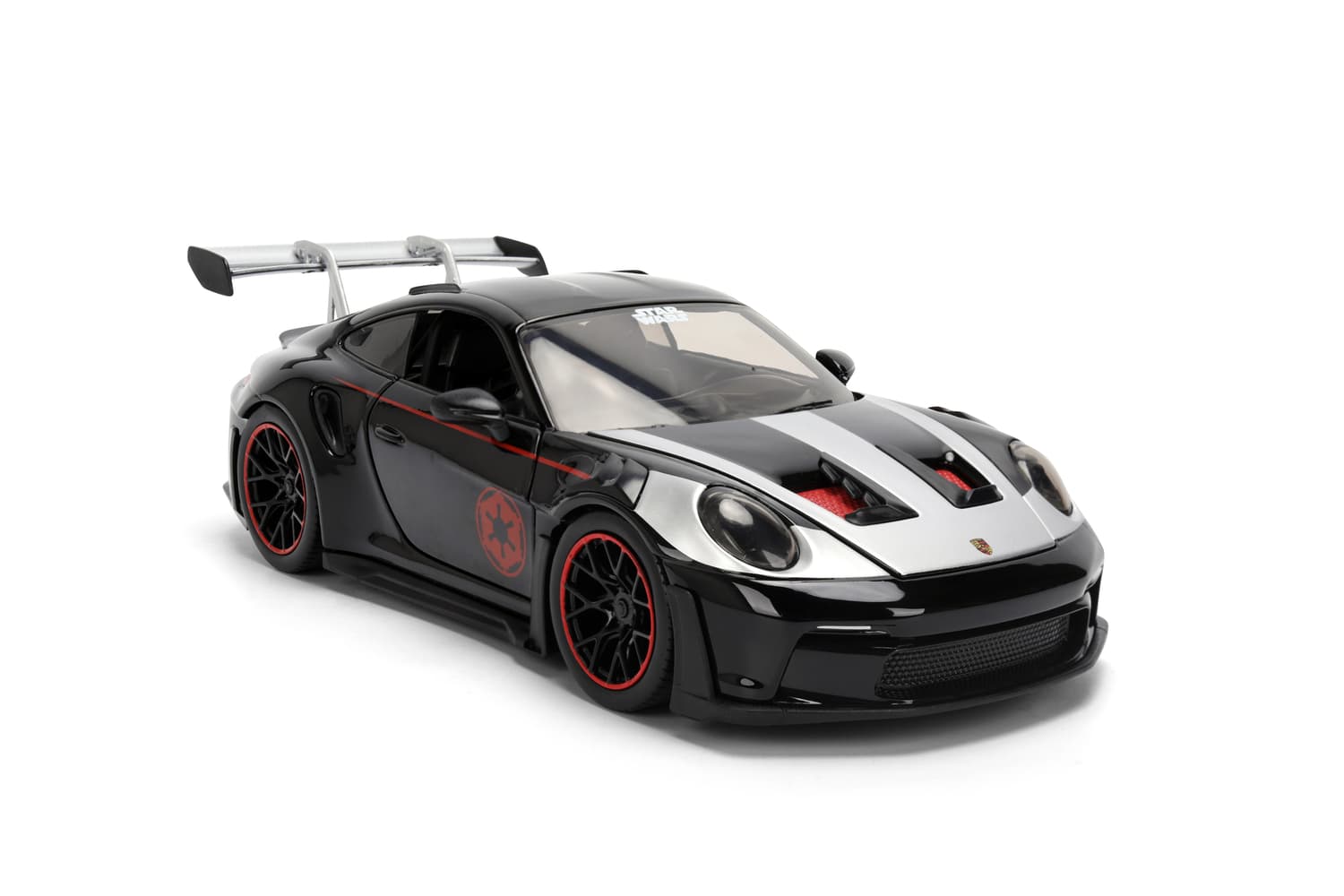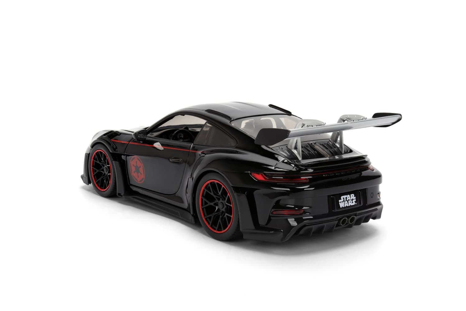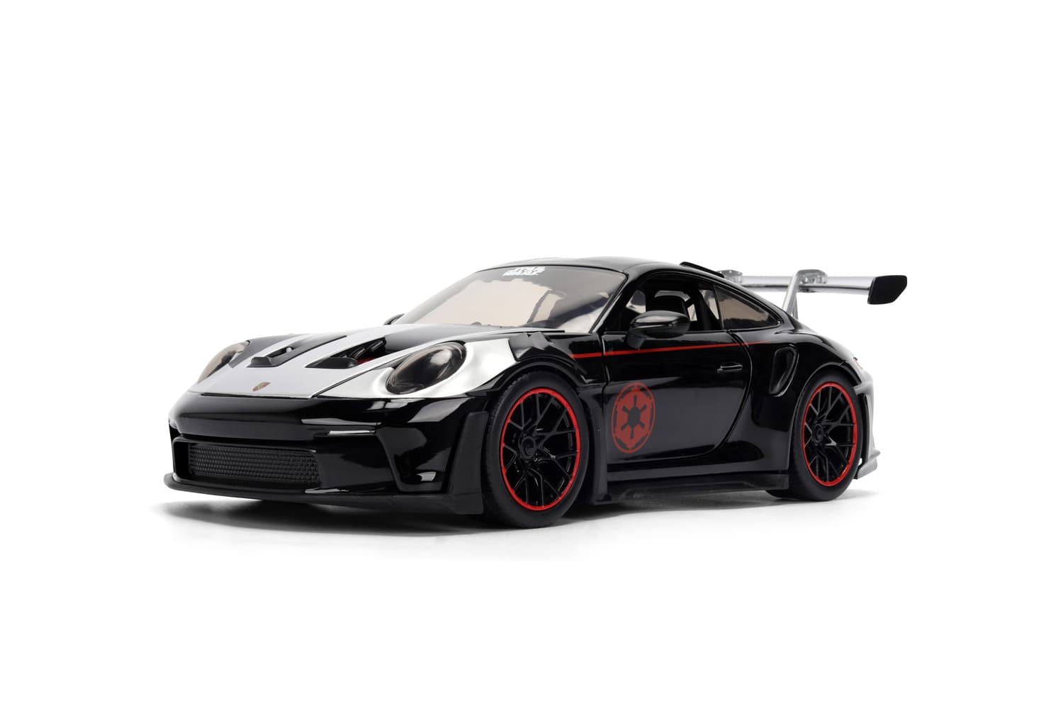 Dieses Modellfahrzeug bringt galaktische Power auf die Straße: Der Porsche 911 GT3 RS im Darth Vader Design ist ein absoluter Blickfang mit seinem mattschwarzen Body, dem roten Symbol des Imperiums und detailreicher Verarbeitung. Die mitgelieferte Darth Vader Figur rundet das Set perfekt ab – ein Muss für Fans, Sammler und Liebhaber besonderer Fahrzeuge.