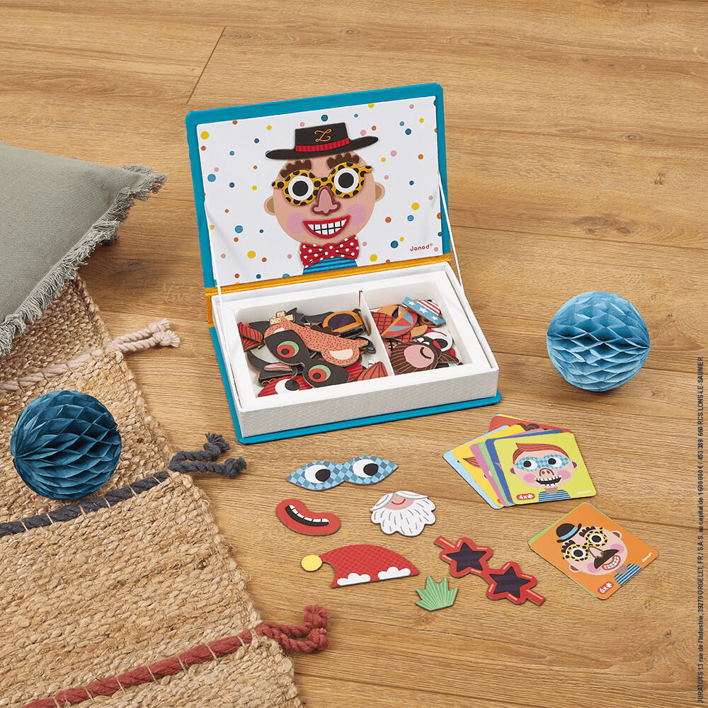 Mit dem Magneti'Book Crazy Face Boys von Janod gestalten Kinder fantasievolle Gesichter und Figuren – ganz nach Vorlage oder eigener Vorstellung. Die 70 Magnetteile und 12 Karten bieten unzählige Kombinationsmöglichkeiten und regen die Kreativität sowie das visuelle Denken an. Dank des cleveren Buchformats bleibt alles ordentlich verstaut und ist ideal für unterwegs – ob im Auto, im Wartezimmer oder auf Reisen. Ein hochwertiges Spiel aus nachhaltig produzierter Pappe, das Kinder von 3 bis 8 Jahren begeistert und ihre Ausdruckskraft spielerisch fördert.