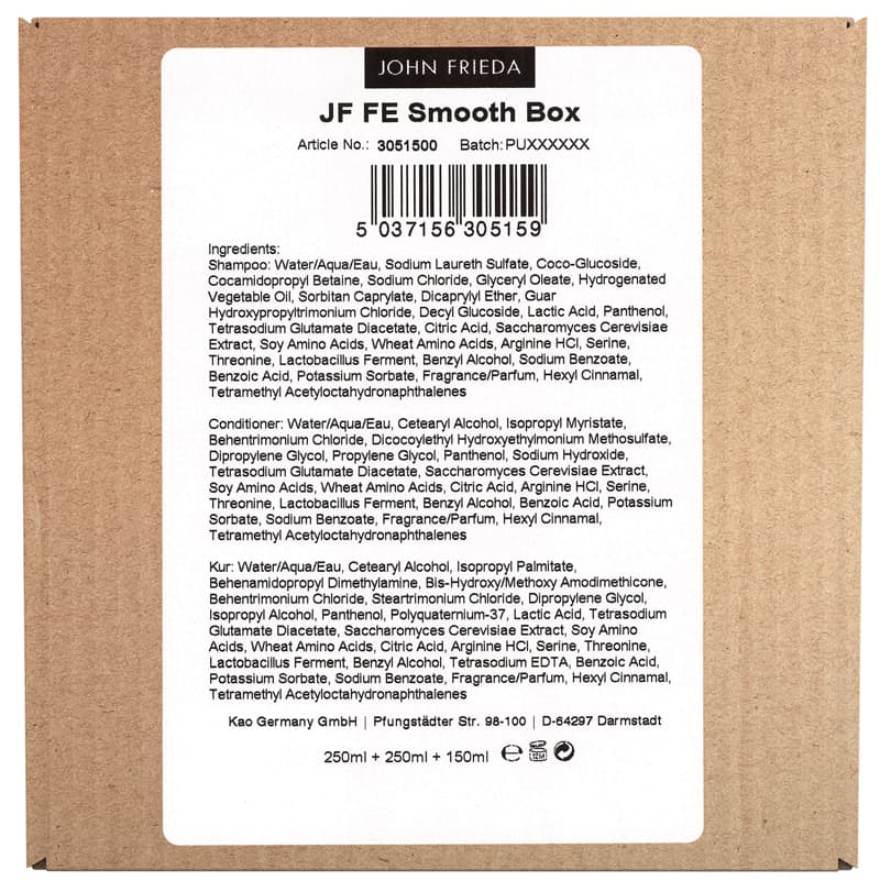 | Inhaltsstoffe | Shampoo: Water/Aqua/Eau, Sodium C14-16 Olefin Sulfonate, Cocamidopropyl Betaine, Lauryl Hydroxysultaine, Sodium Chloride, Glyceryl Oleate, Hydrogenated Vegetable Oil, Polyquaternium-10, Sorbitan Caprylate, Lactic Acid, Sodium Hydroxide, Panthenol, Tetrasodium Glutamate Diacetate, Citric Acid, Rosa Canina Fruit Oil, Tocopherol, Sodium Benzoate, Fragrance/Parfum, Hexyl Cinnamal, Tetramethyl Acetyloctahydronaphthalenes Ingredient Conditioner: Water/Aqua/Eau, Cetearyl Alcohol, Isopropyl Myristate, Behentrimonium Chloride, Dicocoylethyl Hydroxyethylmonium Methosulfate, Dipropylene Glycol, Propylene Glycol, Panthenol, Sodium Hydroxide, Tetrasodium Glutamate Diacetate, Rosa Canina Fruit Oil, Citric Acid, Tocopherol, Benzoic Acid, Fragrance/Parfum, Hexyl Cinnamal, Tetramethyl Acetyloctahydronaphthalenes Ingredient Spray: Aqua, Glycerin, VP/VA Copolymer, Polysorbate 20, Amodimethicone, Dimethicone PEG-8 Meadowfoamate, Olive Oil PEG-7 Esters, Magnesium Sulfate, Panthenol, VP/ Dimethylaminoethylmethacrylate Copolymer, Parfum, Caprylhydroxamic Acid, Polyquaternium-11, Trideceth12, Methylpropanediol, Cetrimonium Chloride, Rosa Canina Fruit Oil, Citric Acid, Laurtrimonium Chloride, Sodium Bisulfite, Tocopherol, Phenoxyethanol, Sodium Benzoate, Benzyl Salicylate, Hexamethylindanopyran, Linalool, Tetramethyl Acetyloctahydronaphthalenes, Vanillin |