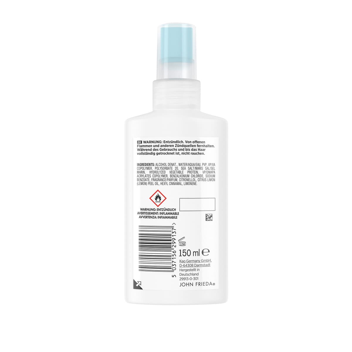 | Inhaltsstoffe | ALCOHOL DENAT., WATER/AQUA/EAU, PVP, VP/VA COPOLYMER, POLYSORBATE 20, SEA SALT/MARIS SAL/SEL MARIN, HYDROLYZED VEGETABLE PROTEIN, VP/DMAPA ACRYLATES COPOLYMER, BENZALKONIUM CHLORIDE, SODIUM BENZOATE, FRAGRANCE/PARFUM, CITRONELLOL, CITRUS LIMON (LEMON) PEEL OIL, HEXYL CINNAMAL, LIMONENE. |