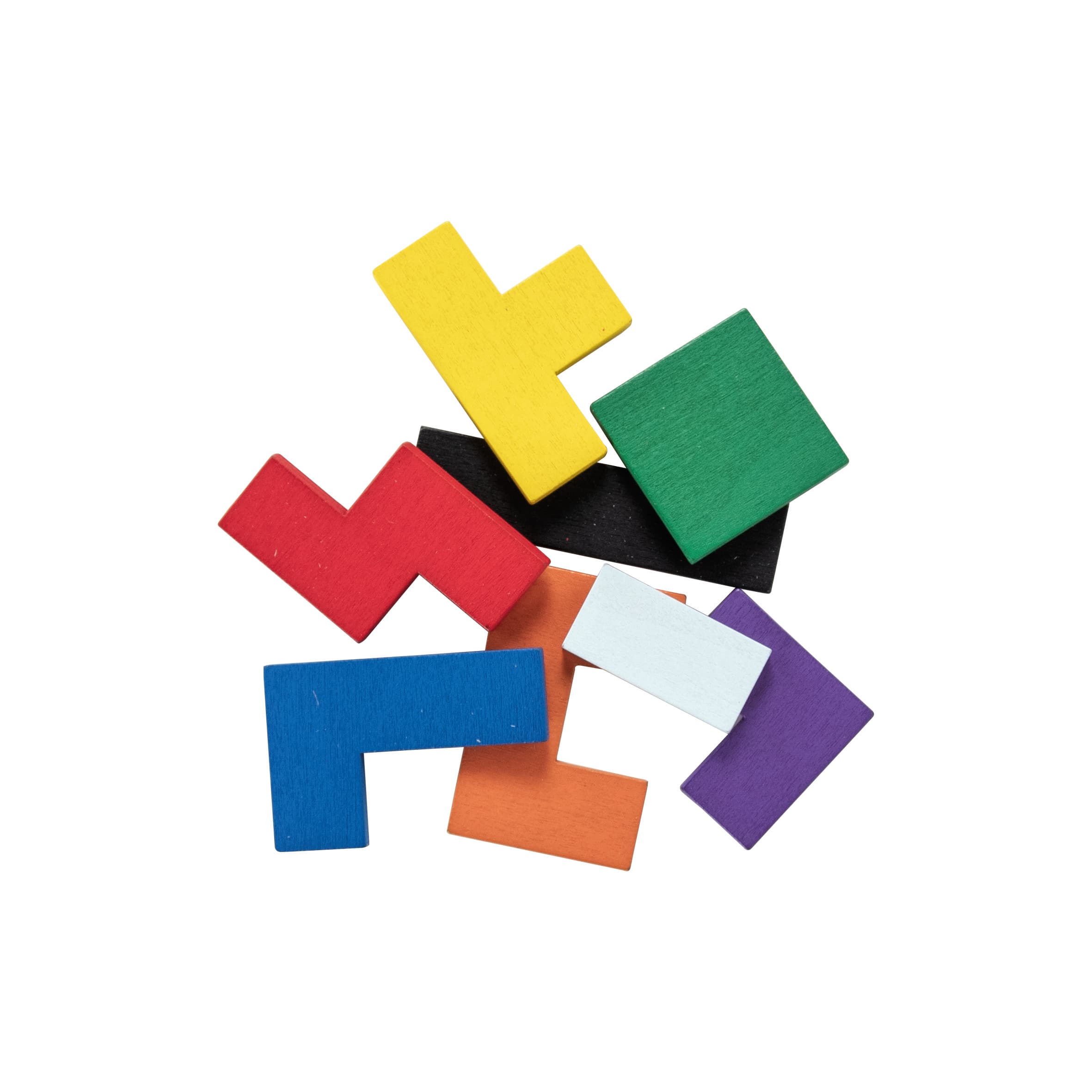 Mit dem Holz Block Puzzle können aus 40 bunten Holzblöcken verschiedene Muster und Figuren gelegt werden auf einem Brett.
