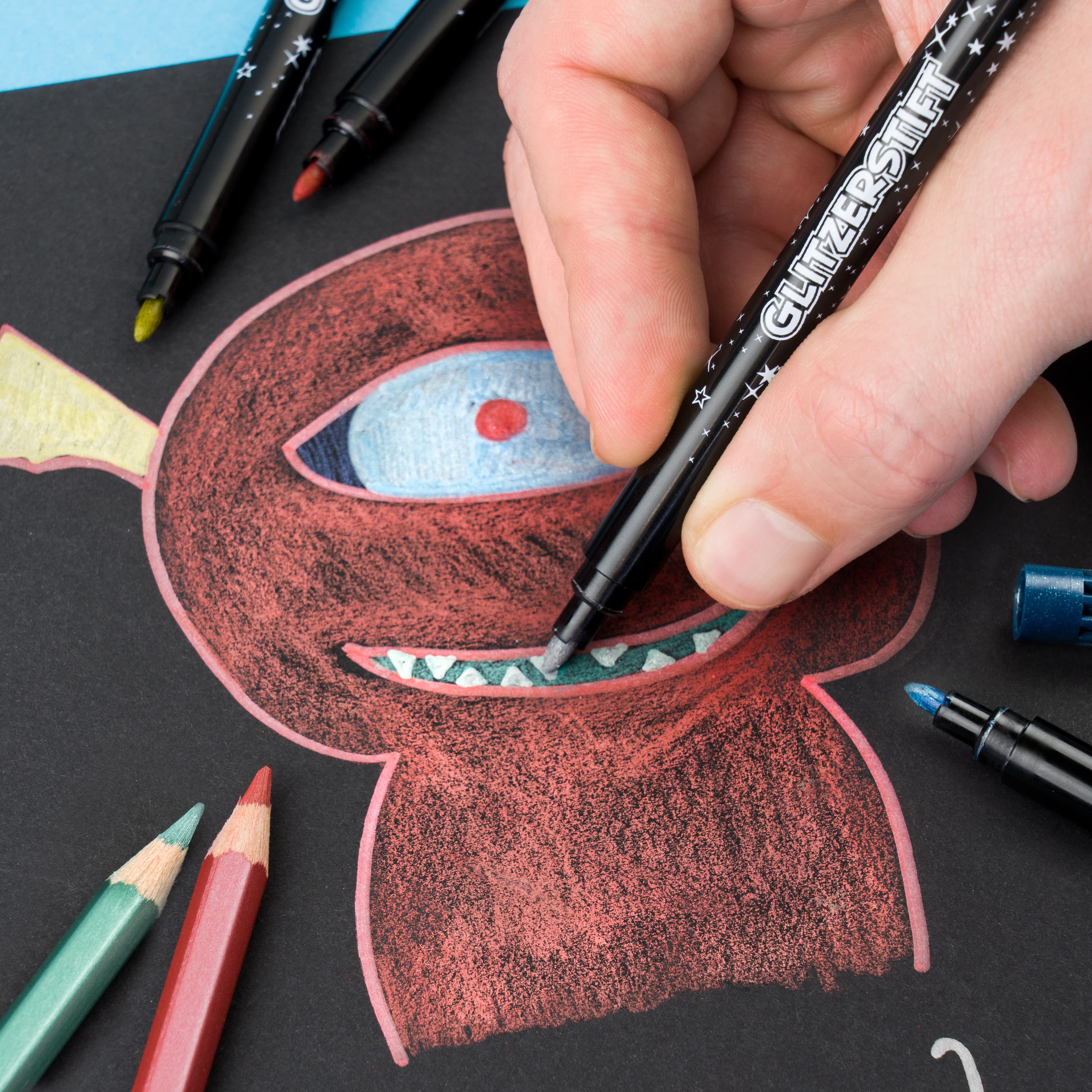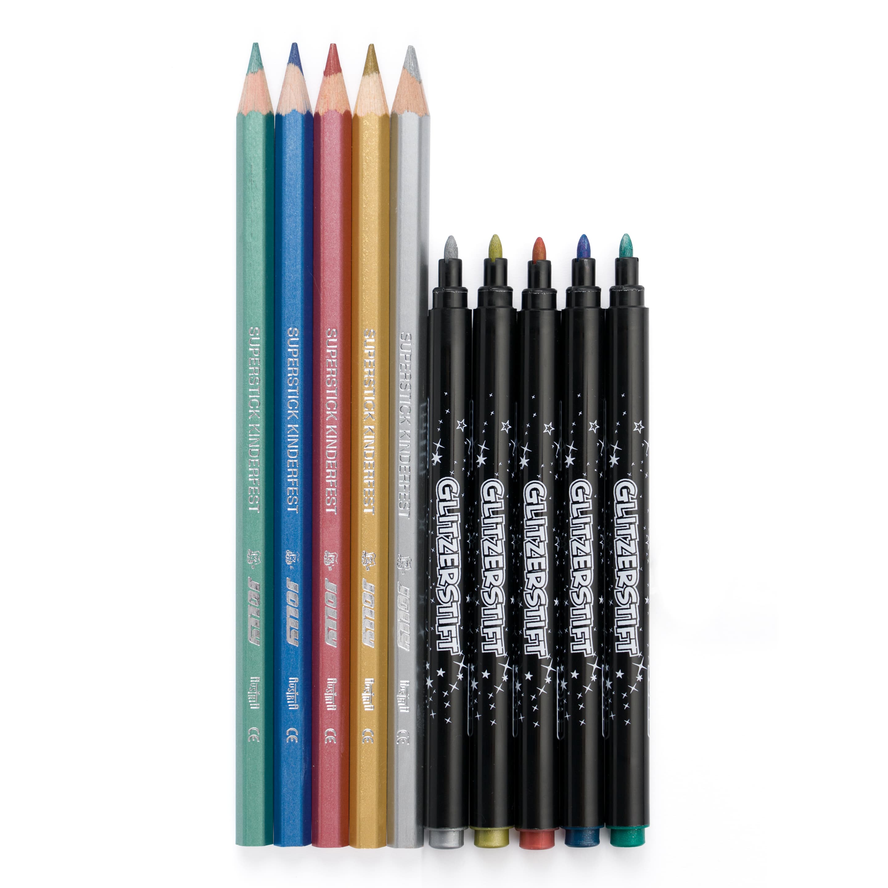 Glitzer-Set ! Auf die Plätze, Glitzer, los!Das Glitzer-Set von Jolly garantiert funkelnden Malspaß für deine Kinder! Das Set besteht aus 10 Stiften mit Metallic-Effekt.5 Glitzer-Fasermaler und 5 Glitzer-Buntstifte entführen Groß und Klein in eine ganze besondere Mal- und Zeichenwelt!Die Fasermaler können auch auf allen rauen Oberflächen verwendet werden und setzen so (vor allem dunkle) Gegenstände in Glitzer-Szene!*5 Fasermaler*5 Buntstifte*besonders satte Farbenl*anganhaltender Malspaß
