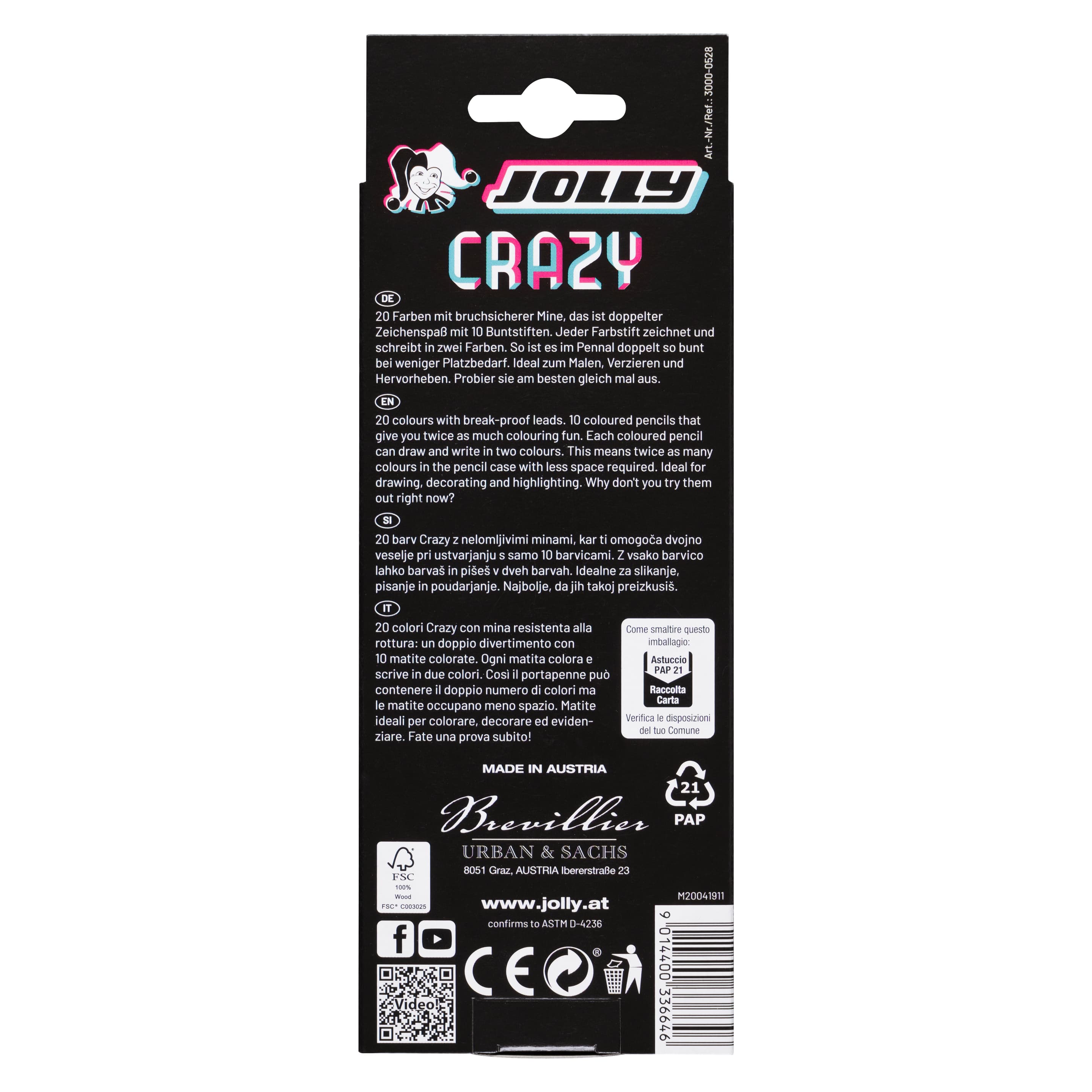 Jolly's NEXT GENERATION - 10 Crazy BuntstifteCrazy Buntstifte aus rundem, schwarzem Holz aus nachhaltiger Forstwirtschaft, 10 Stifte = 20 Farben, zwei Farben in einem Stift, somit ist im Pennal mehr Platz, bruchsichere Mine, Stifte Made in Austria, attraktives neues Jolly Design, Zielgruppe 10-15 Jahre, Farbkombinationen: Hellgün - Mittelbraun, Zartgrün-Blaugrün, Himmelblau - Dunkelblau, Lichtblau - Dunkelgrün, Dunkelrosa - Helltürkis, Hellrosa - Rose, Orange - Schwarz, Creme - Dunkelbraun, Hellgelb - Kirschrot; Zitronengelb - Violett;