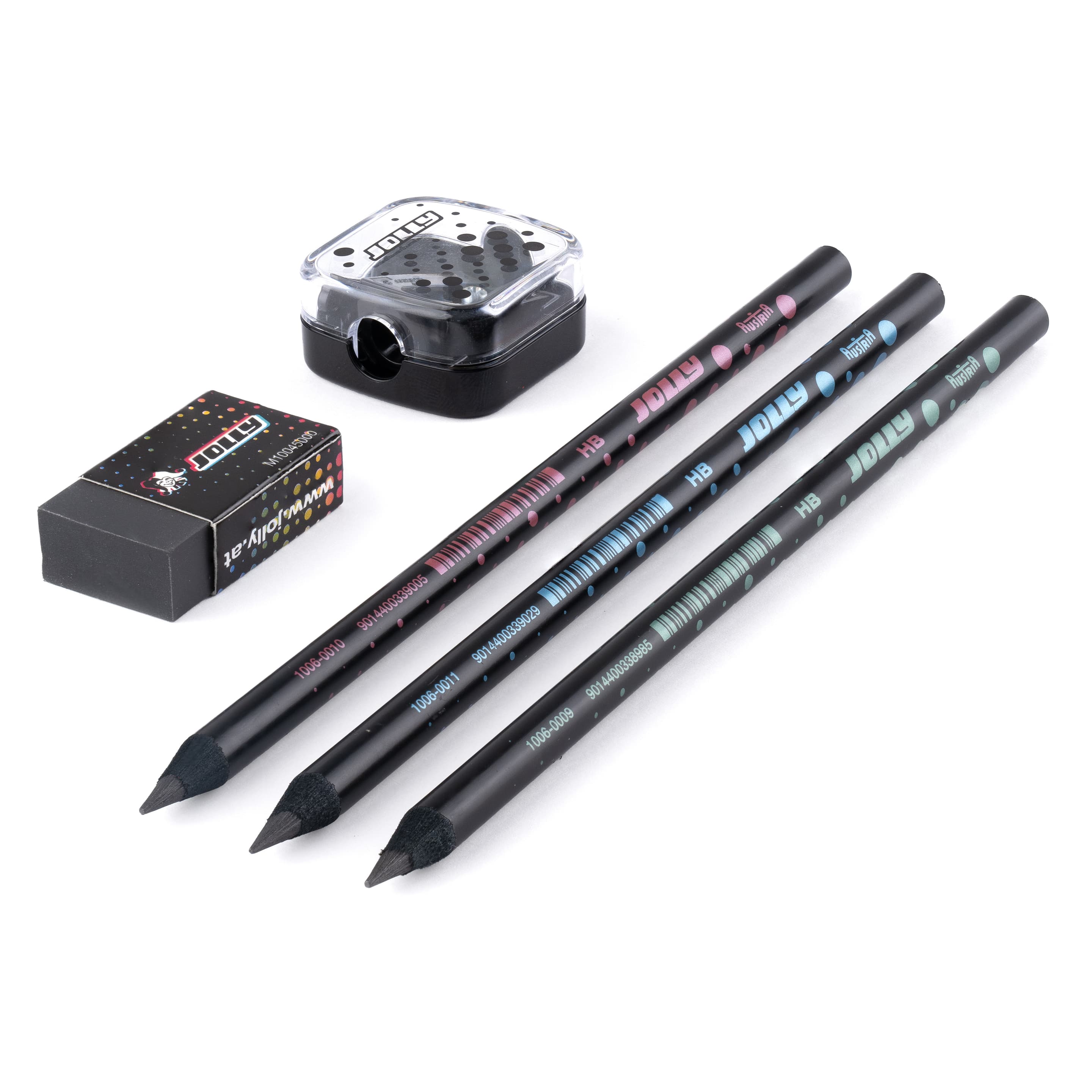 Jolly's NEXT GENERATION - Graphit Set 3xHB Graphitstifte mit Spitzer und Radierer Graphitestifte HB aus rundem, schwarzem Holz aus nachhaltiger Forstwirtschaft, passend zum neuen Design mit Radierer und Spitzer, bruchsichere dicke 3,8mm Mine, attraktives neues Jolly Design, Zielgruppe 10-15 Jahre