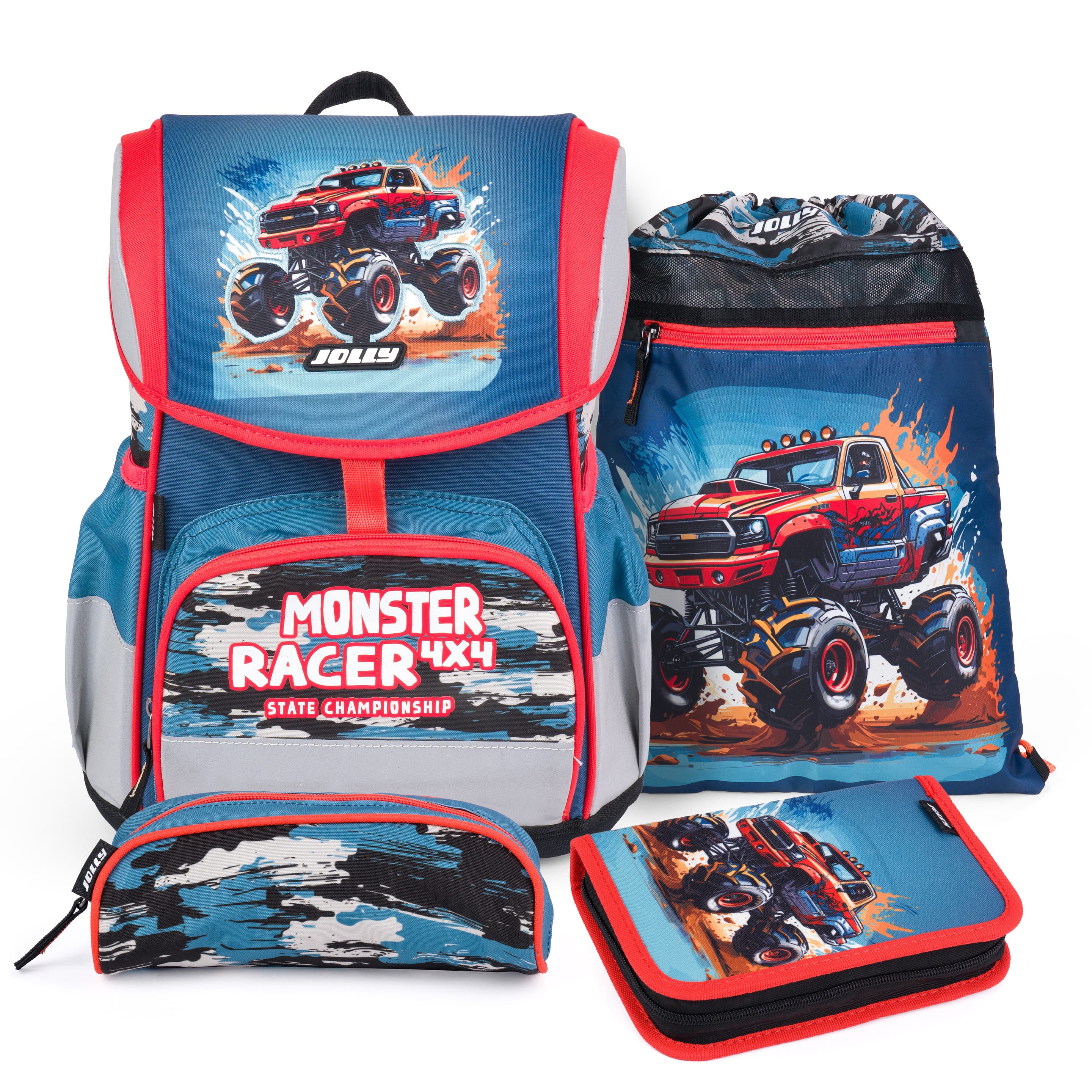 JOLLY Schultaschenset ERGONOMIC FLEXI 46tlg. Inkl. Turnbeutel, Schüttelpennal und Federpennal • Schultasche mit Magnet-Verschluss • Höhenverstellbarer Rücken mitPush-System – an die Größe des Kindes anpassbar • Tragegriff • Verstellbare Schultergurte • Verstellbarer Brustgurt und abnehmbarer Beckengurt • Rückenpolsterung fürguten Tragekomfort • Großes geräumiges Innenfach mit extra Bücherfach • Stundenplanfach im Deckel innen • Isoliertes Front-Fach für Jausenbox • Zwei seitlicheTaschen mit Gummizug • Stabiler Unterboden • Reflektierende Sicherheitsstreifen für gute Sichtbarkeit • Turnbeutel mit Extrafach und Belüftung • Schüttelpennal • 1-Zipp Federpennal mit Klappen und Stundenplanfach • 2 Jahre Garantie