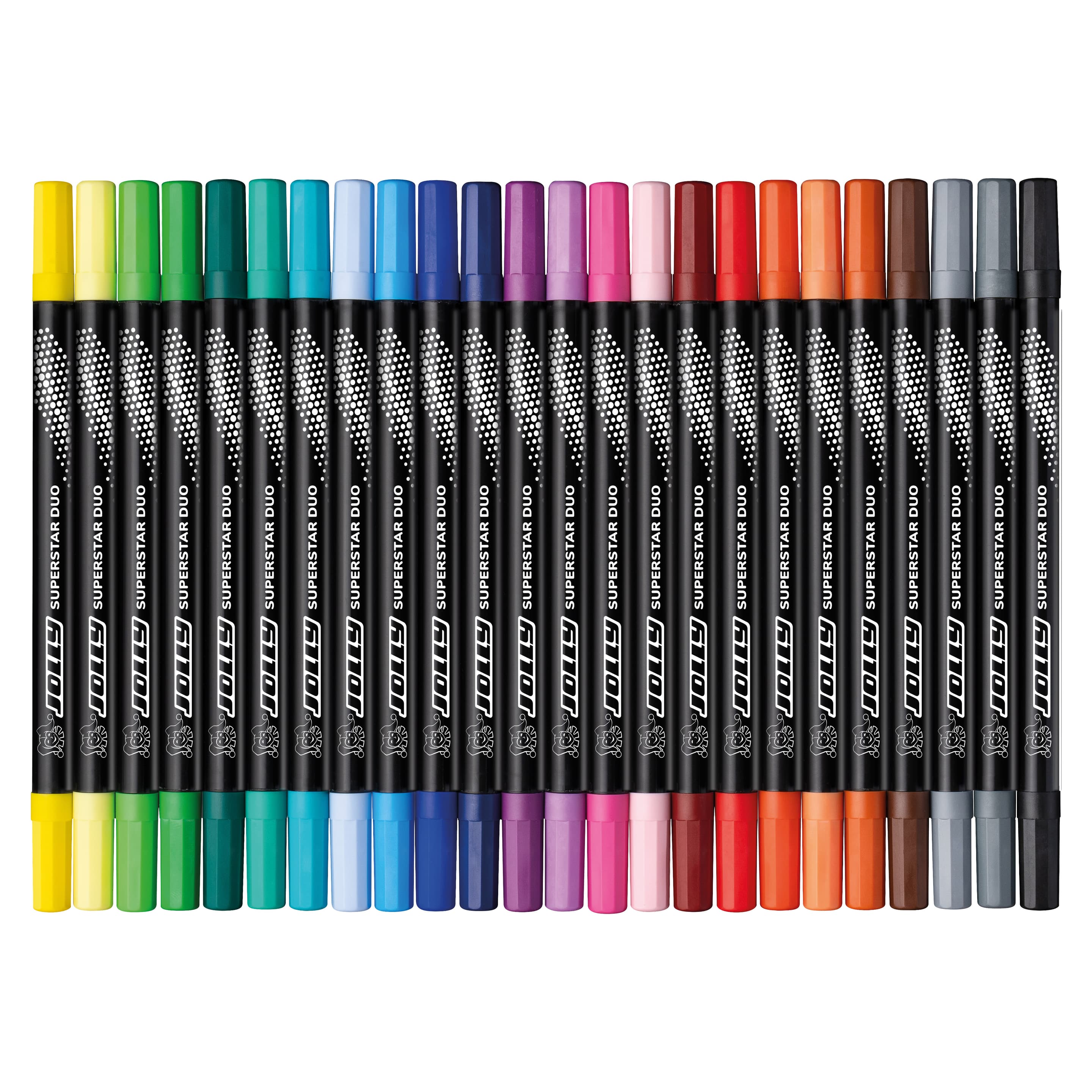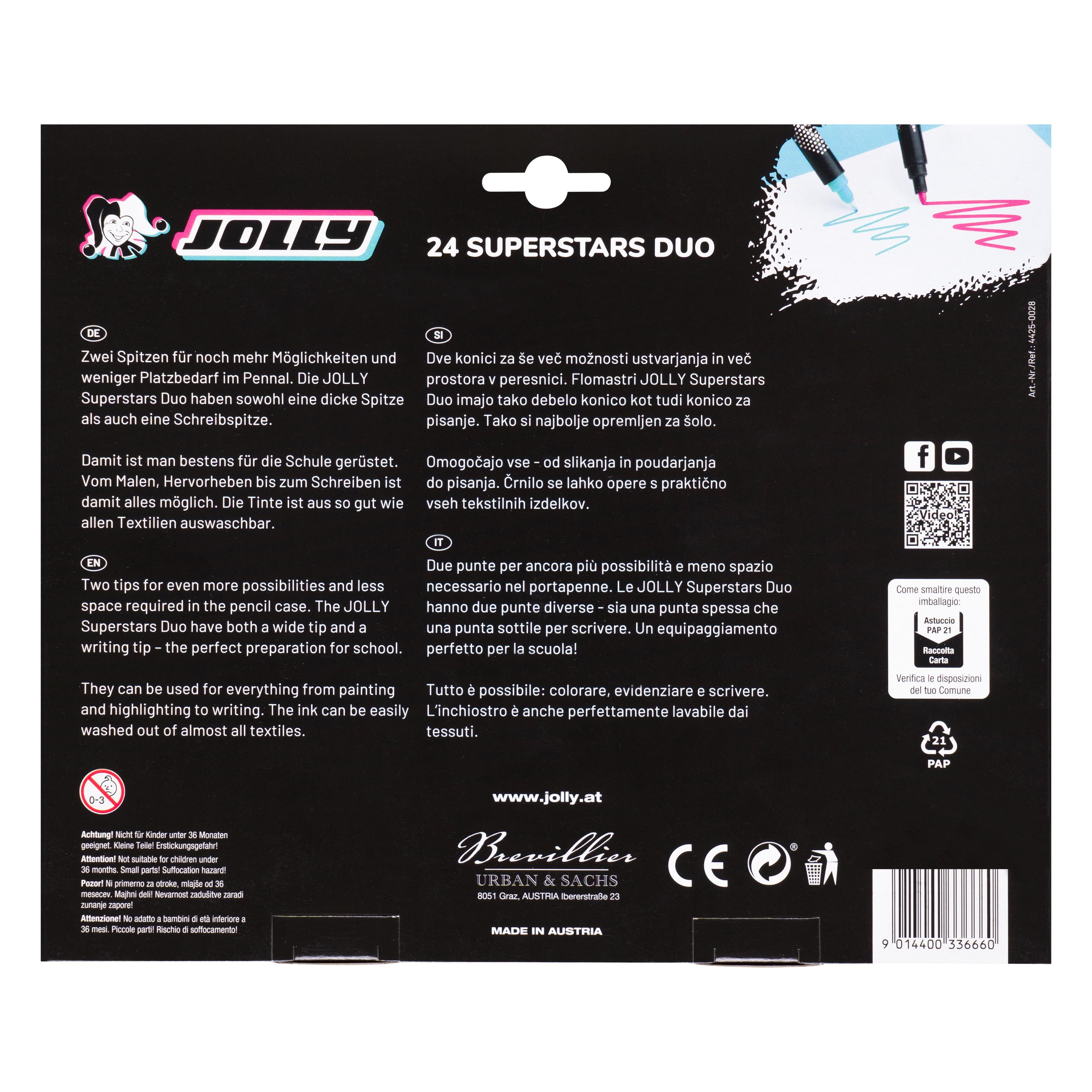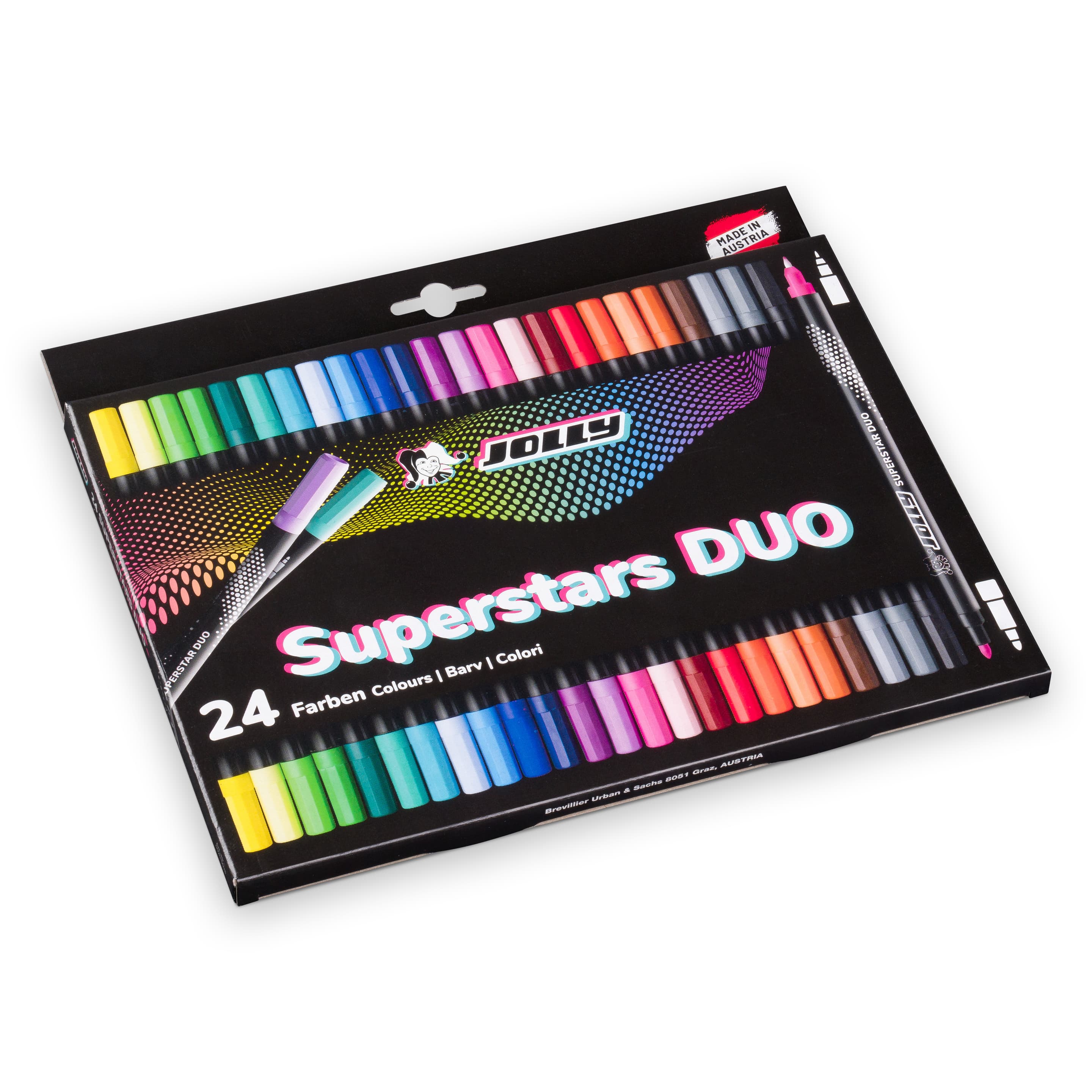 Jolly's NEXT GENERATION - 24 DUO Fasermaler mit 2 Spitzeneine dicke Spitze und eine Schreibspitze, attraktives neuees Jolly DesignZielgruppe 10-15 Jahre , bunte, geschlossene Kappen und schwarzer SchaftMade in Austria, 11 neue Farben