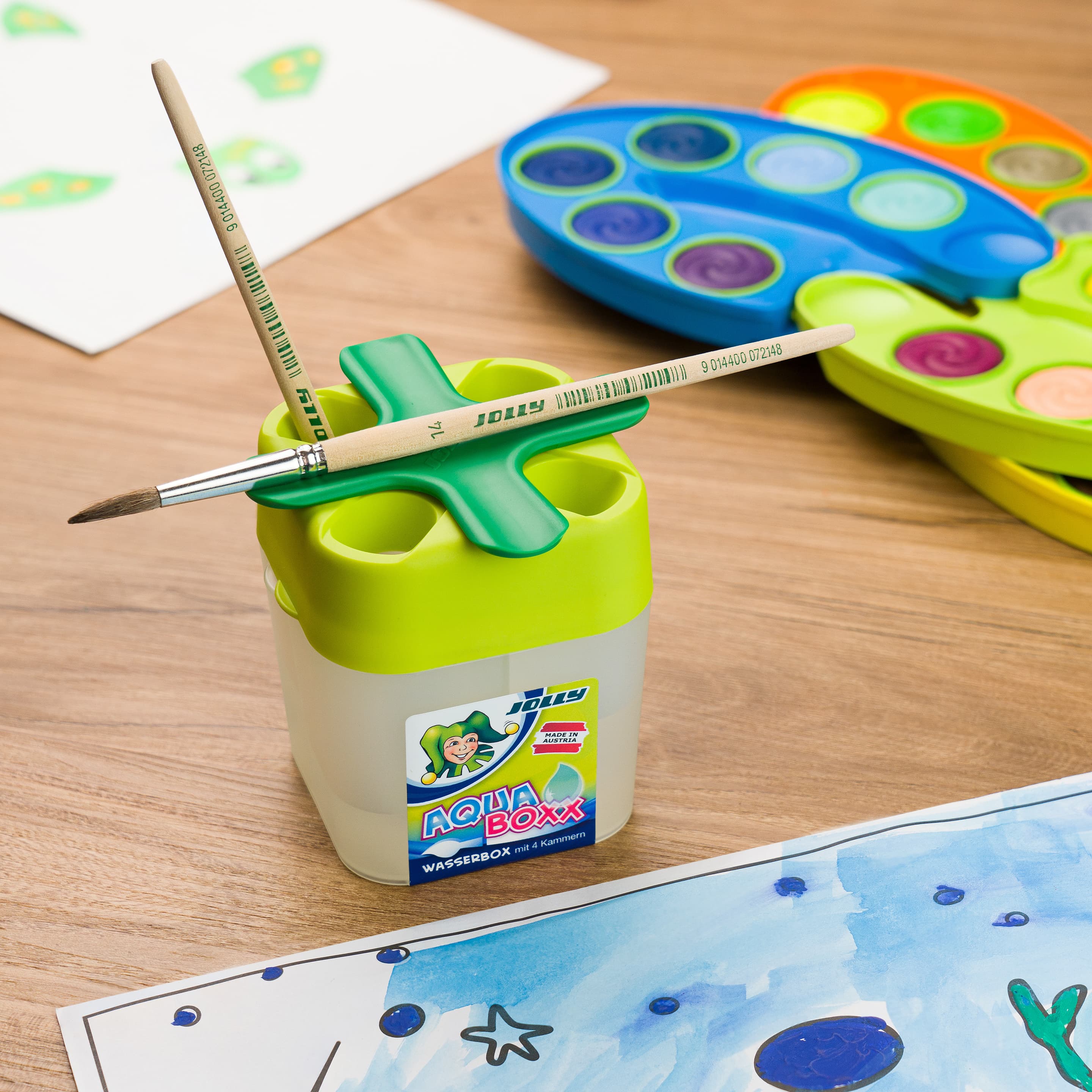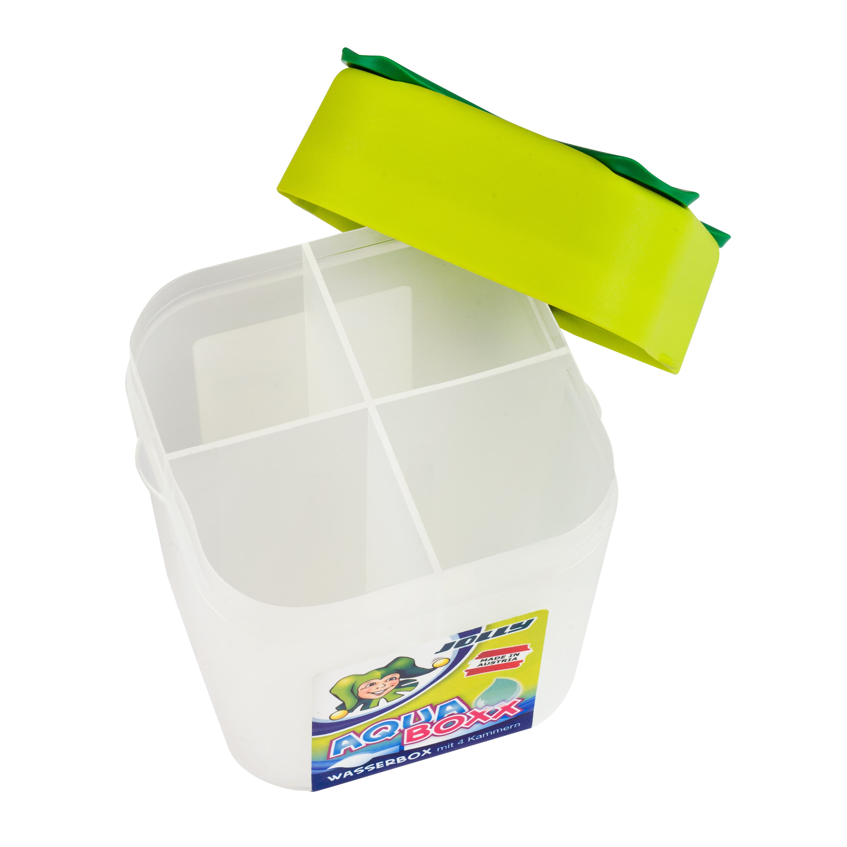 Mit der neuen JOLLY'Aqua Boxx'ist jetzt noch länger anhaltender Malspaß garantiert! Sauberes von gebrauchtem Wasser zu trennen ist dank der 4 integrierten Kammern ab sofort ein Kinderspiel! Der drehbare Flügelverschluss ist mit einer leichten Vertiefung versehen sodass dort problemlos nasse Pinsel abgelegt werden können. So ist der Pinsel immer griffbereit und die Farbe bleibt dort, wo sie hingehört ?? Made in Austria!