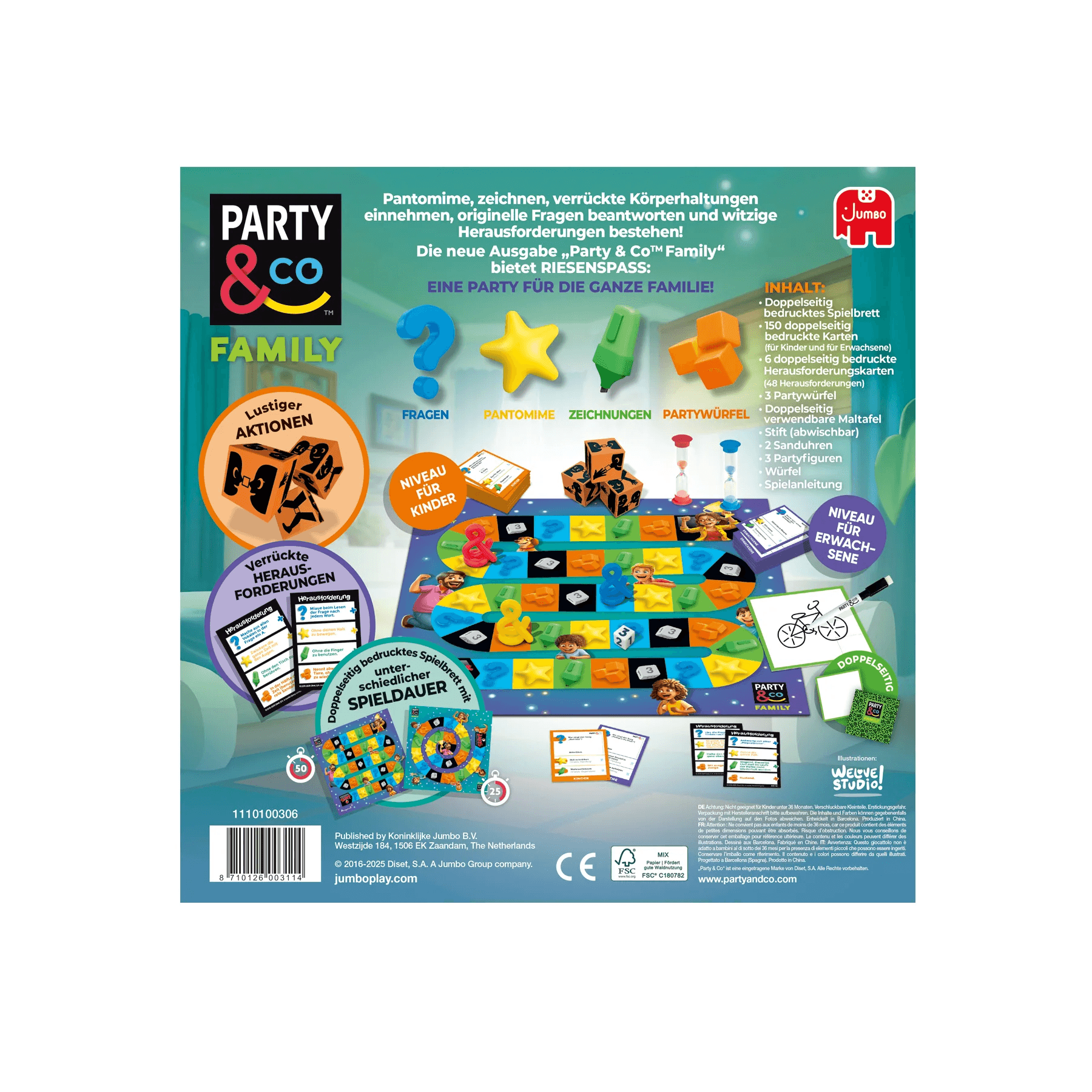 Spielmechanik: Die Teams lösen Aufgaben in fünf Kategorien, um sich auf dem Spielbrett vorwärts zu bewegen. Wer zuerst die Mitte erreicht und die finale Herausforderung meistert, gewinnt. Kreativität, Teamgeist und jede Menge Familienspaß garantiert!