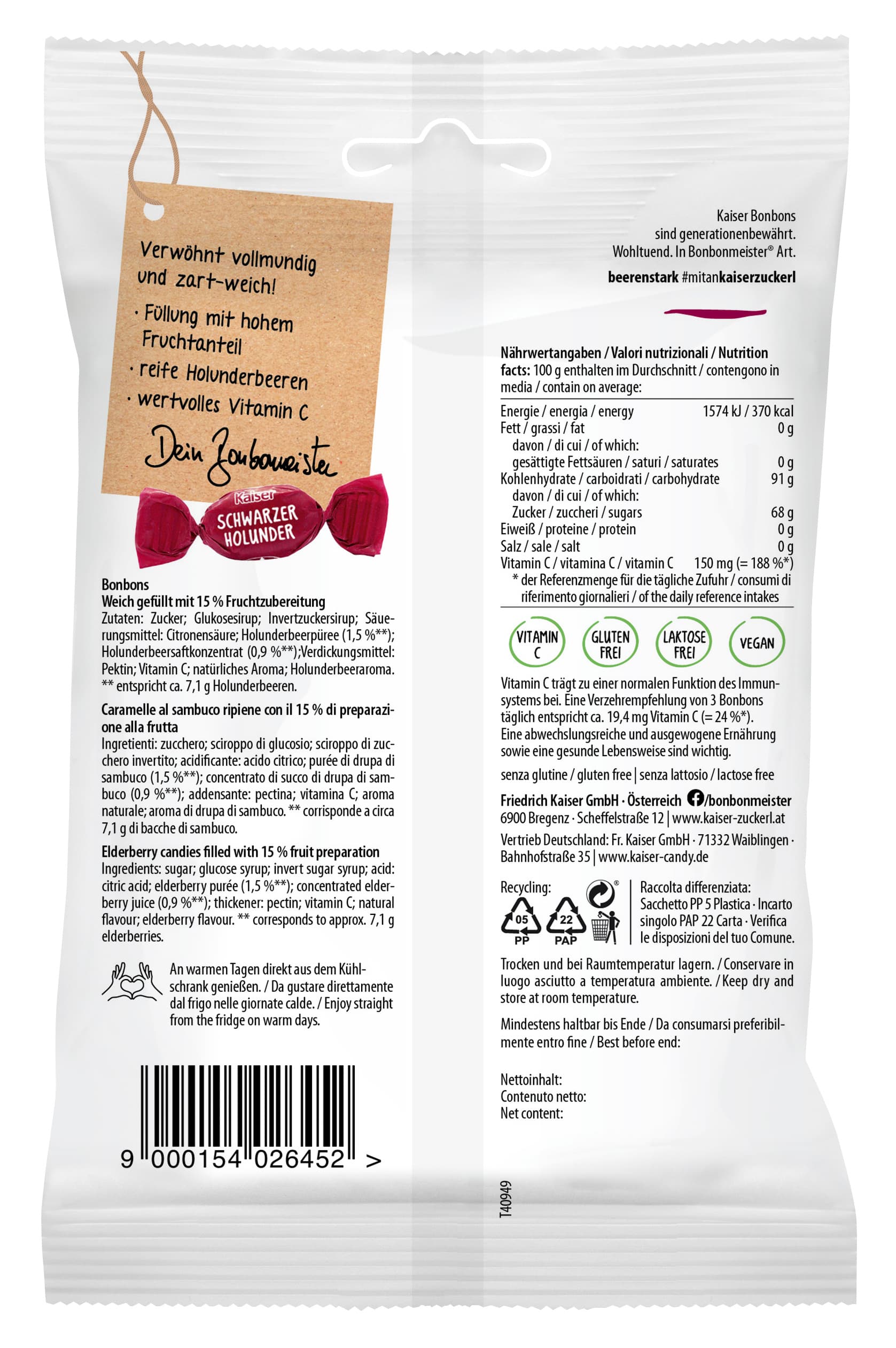 | Zutaten | Zucker; Glukosesirup; Invertzuckersirup; Säuerungsmittel: Citronensäure; Holunderbeerpüree (1,5 %**); Holunderbeersaftkonzentrat (0,9 %**);Verdickungsmittel: Pektin; Vitamin C; natürliches Aroma; Holunderbeeraroma. ** entspricht ca. 7,1 g Holunderbeeren. |