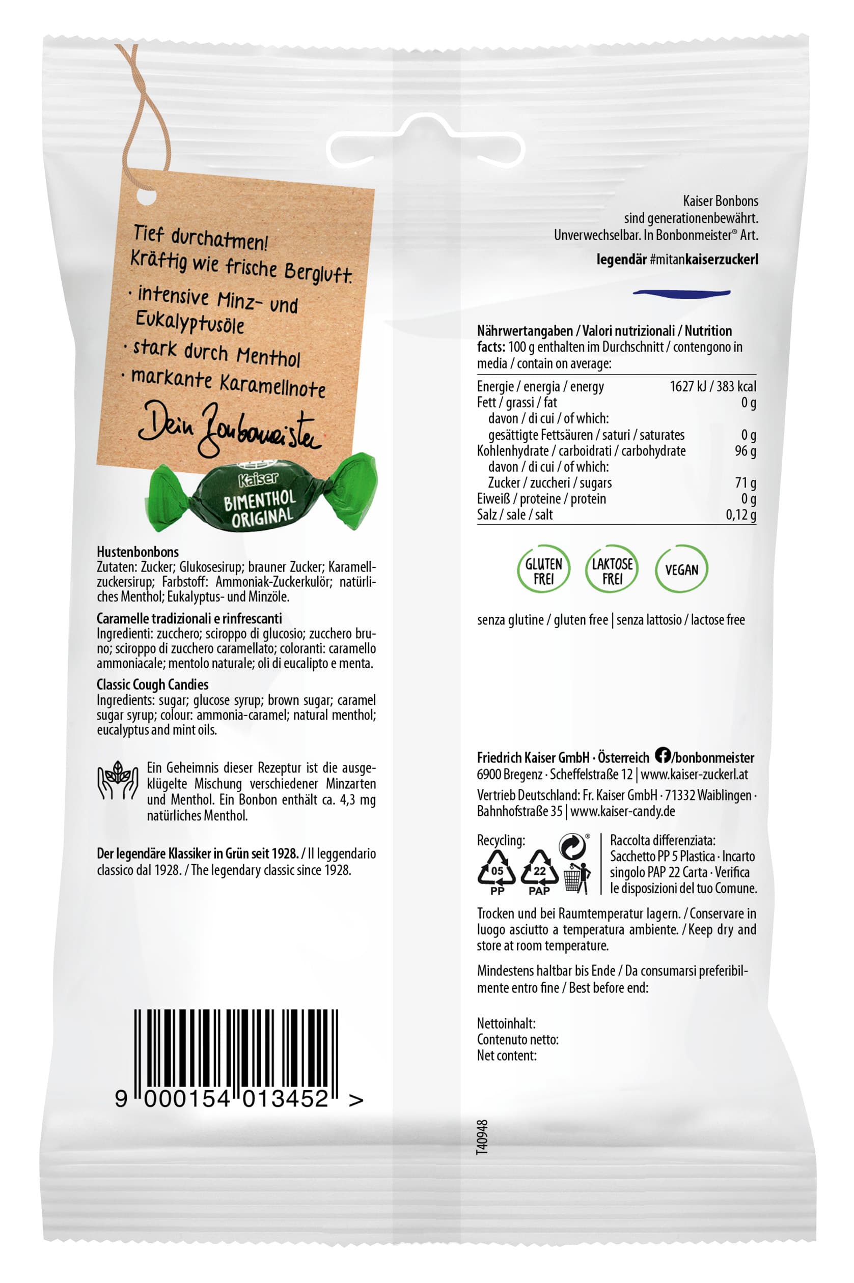 | Zutaten | Zucker; Glukosesirup; brauner Zucker;Karamellzuckersirup; Farbstoff: Ammoniak-Zuckerkulör; natürliches Menthol; Eukalyptus- und Minzöle. Ein Bonbon enthält ca. 4,3 mg natürliches Menthol. |