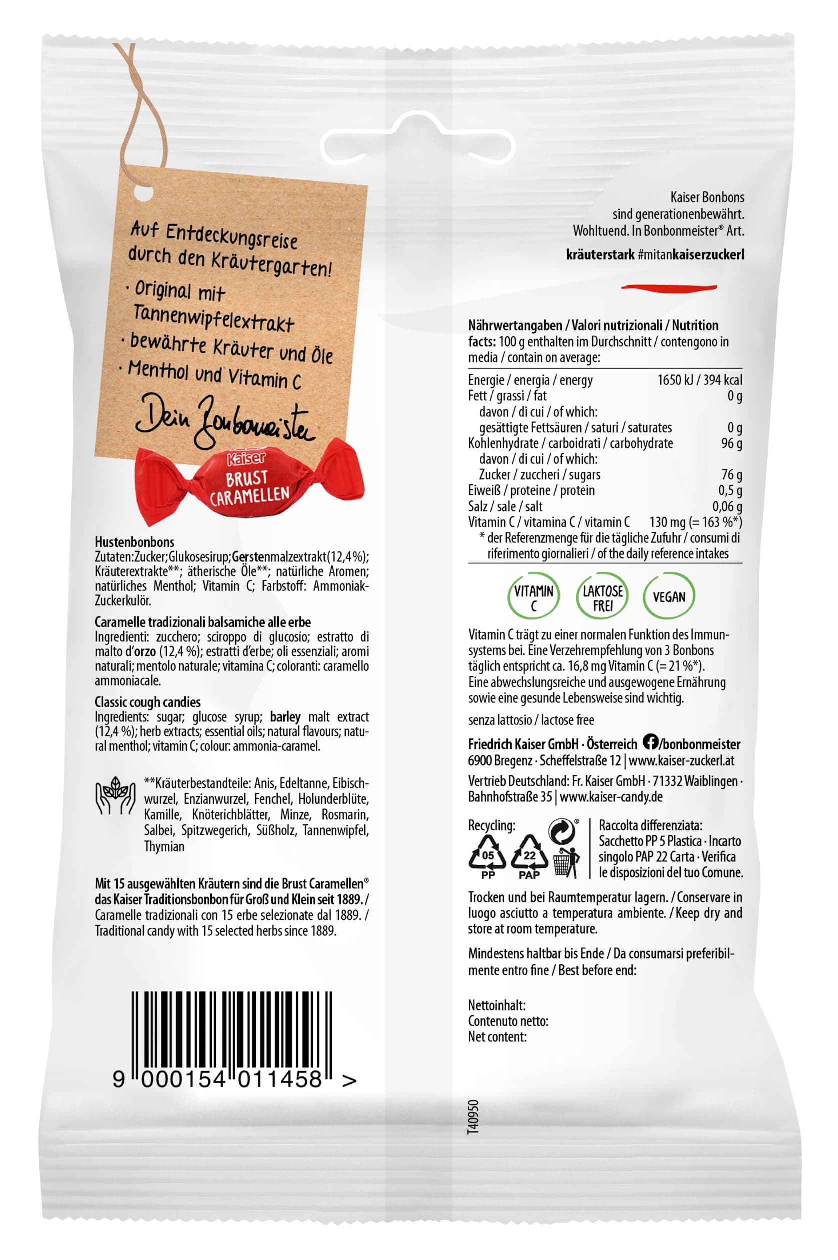 | Zutaten | Zucker; Glukosesirup; GERSTEnmalzextrakt (12,4%); Kräuterextrakte**; ätherische Öle**; natürliche Aromen; natürliches Menthol; Vitamin C; Farbstoff: Ammoniak-Zuckerkulör. **Kräuterbestandteile: Anis, Edeltanne, Eibischwurzel, Enzianwurzel, Fenchel, Holunderblüte, Kamille, Knöterichblätter, Minze, Rosmarin, Salbei, Spitzwegerich, Süßholz, Tannenwipfel, Thymian |