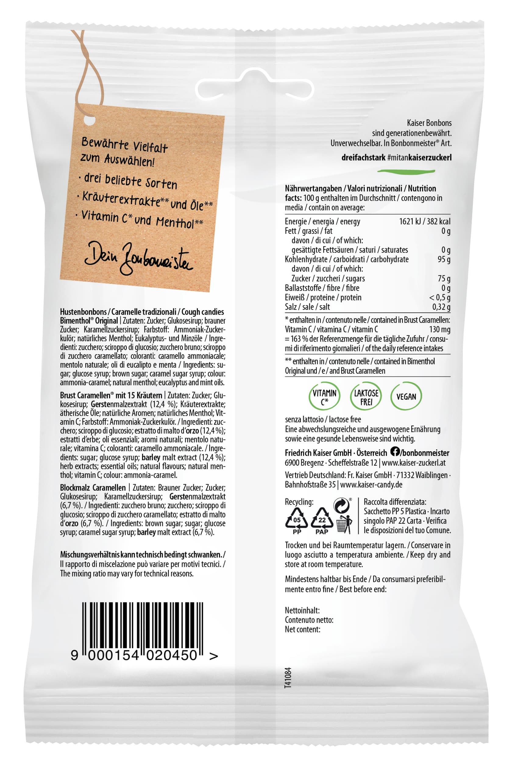 | Zutaten | Bimenthol Original | Zutaten: Zucker; Glukosesirup; brauner Zucker; Karamellzuckersirup; Farbstoff: Ammoniak-Zuckerkulör; natürliches Menthol; Eukalyptus- und Minzöle Brust Caramellen mit 15 Kräutern | Zutaten: Zucker; Glukosesirup; GERSTEnmalzextrakt (12,4 %); Kräuterextrakte; ätherische Öle; natürliche Aromen; natürliches Menthol; Vitamin C; Farbstoff: Ammoniak-Zuckerkulör. Blockmalz Caramellen | Zutaten: Brauner Zucker; Zucker; Glukosesirup; Karamellzuckersirup; GERSTEnmalzextrakt (6,7 %). |