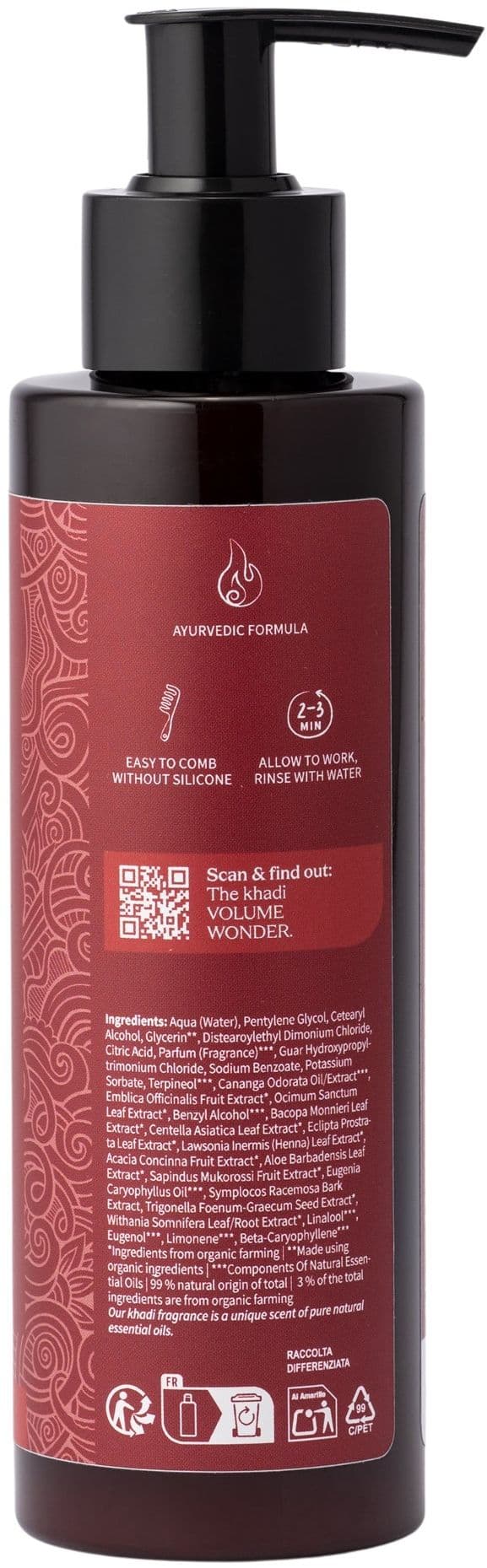 InhaltsstoffeAqua (Water, Pentylene Glycol, Cetearyl Alcohol, Glycerin**, Distearoylethyl Dimonium Chloride, Citric Acid, Parfum (Fragrance)***, Guar Hydroxypropyltrimonium Chloride, Sodium Benzoate, Potassium Sorbate, Terpineol***, Cananga Odorata Oil/Extract***, Emblica Officinalis Fruit Extract*, Ocimum Sanctum Leaf Extract*, Benzyl Alcohol***, Bacopa Monnieri Leaf Extract*, Centella Asiatica Leaf Extract*, Eclipta Prostrata Leaf Extract*, Lawsonia Inermis Leaf Extract*, Acacia Concinna Fruit Extract*, Aloe Barbadensis Leaf Extract*, Sapindus Mukorossi Fruit Extract*, Eugenia Caryophyllus Oil***, Symplocos Racemosa Bark Extract, Trigonella Foenum-Graecum Seed Extract*, Withania Somnifera Leaf/Root Extract*, Linalool***, Eugenol***, Limonene***, Beta-Caryophyllene*** *Inhaltsstoffe aus kontrolliert biologischem Anbau, **Hergestellt mit biologischen Inhaltsstoffen, **Bestandteile natürlicher ätherischer Öle. 99% natürlichen Ursprungs insgesamt 3% der gesamten Inhaltsstoffe stammen aus kontrolliert biologischem Anbau.