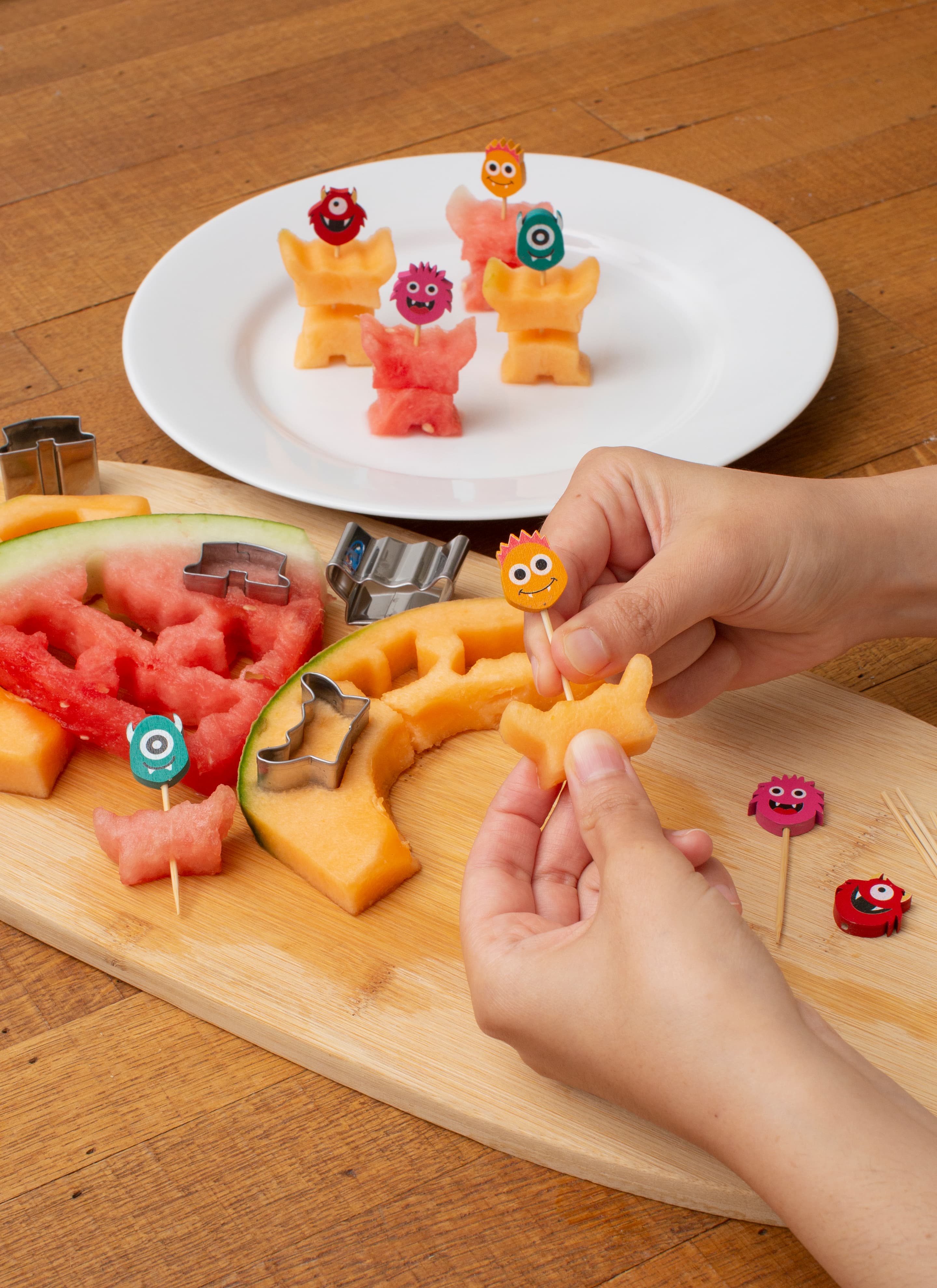 Verwandeln Sie die Snackzeit in Spielzeit. Mit diesen lustigen Monster-Ausstechformen verwandeln Sie Obst in lustige Monster! Das erste Set ist bereits zusammengebaut, verwenden Sie die 24 zusätzlichen Stäbchen für noch mehr Spaß.