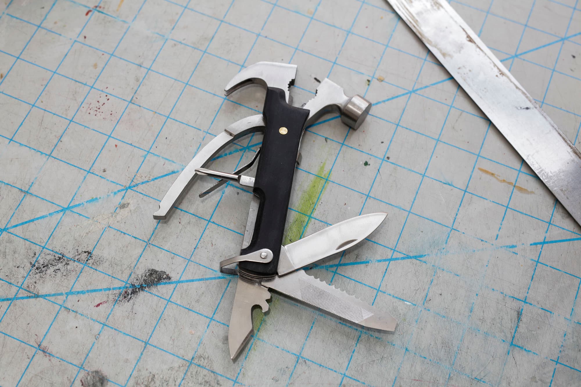 Das Schlüsselanhänger-Tool vereint die Funktionen von Hammer, Zange, Flaschenöffner, Schraubendreher und Messer.Maße in BxHxL: 10x1,8x22 cm