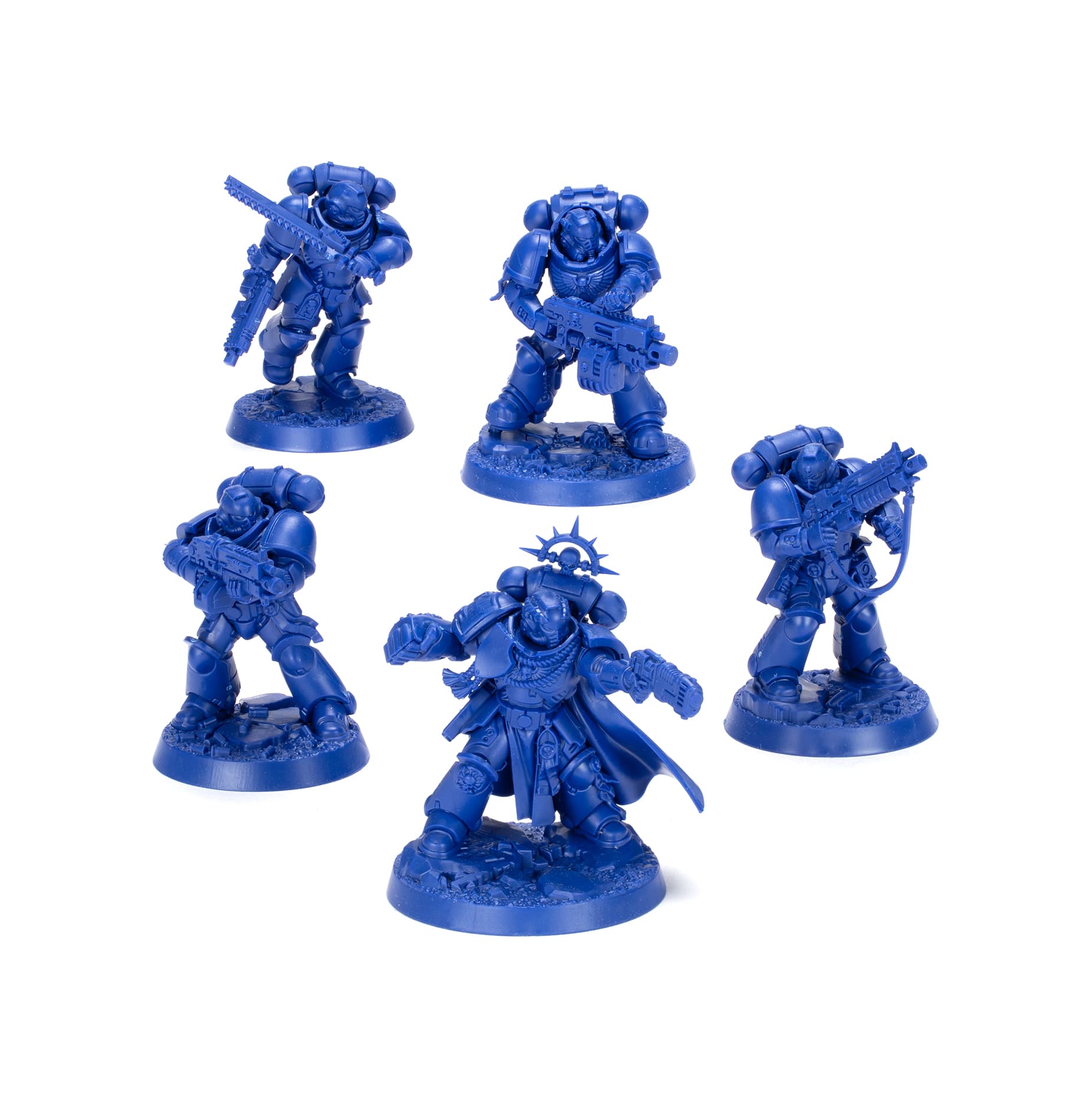 – Fünf Space Marines – genetisch verbesserte Supersoldaten in Servorüstung, die Waffen führen, die selbst die zähesten Ziele vernichten können. Sie sind aus blauen Kunststoff und können ohne Werkzeug gebaut werden.