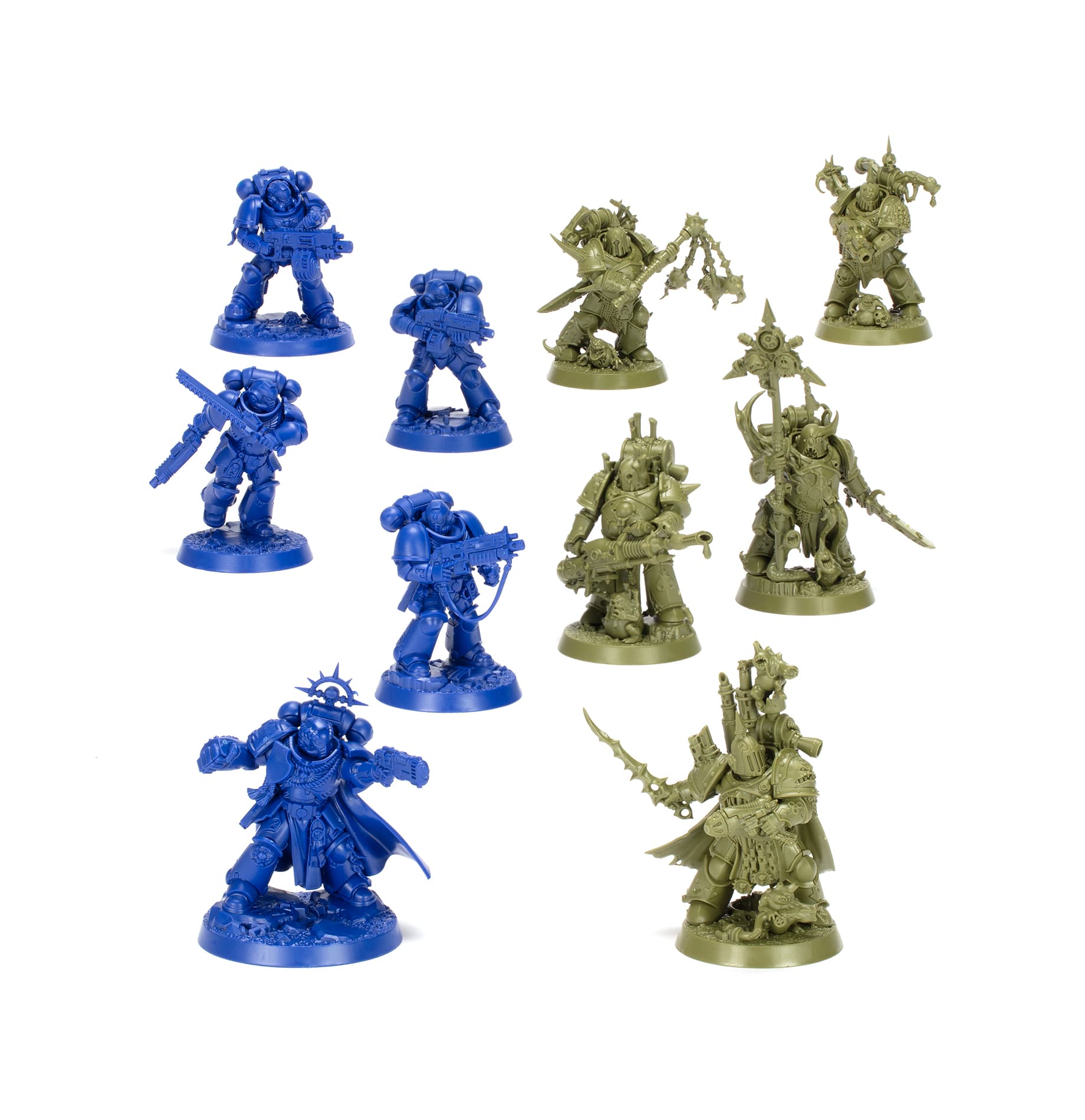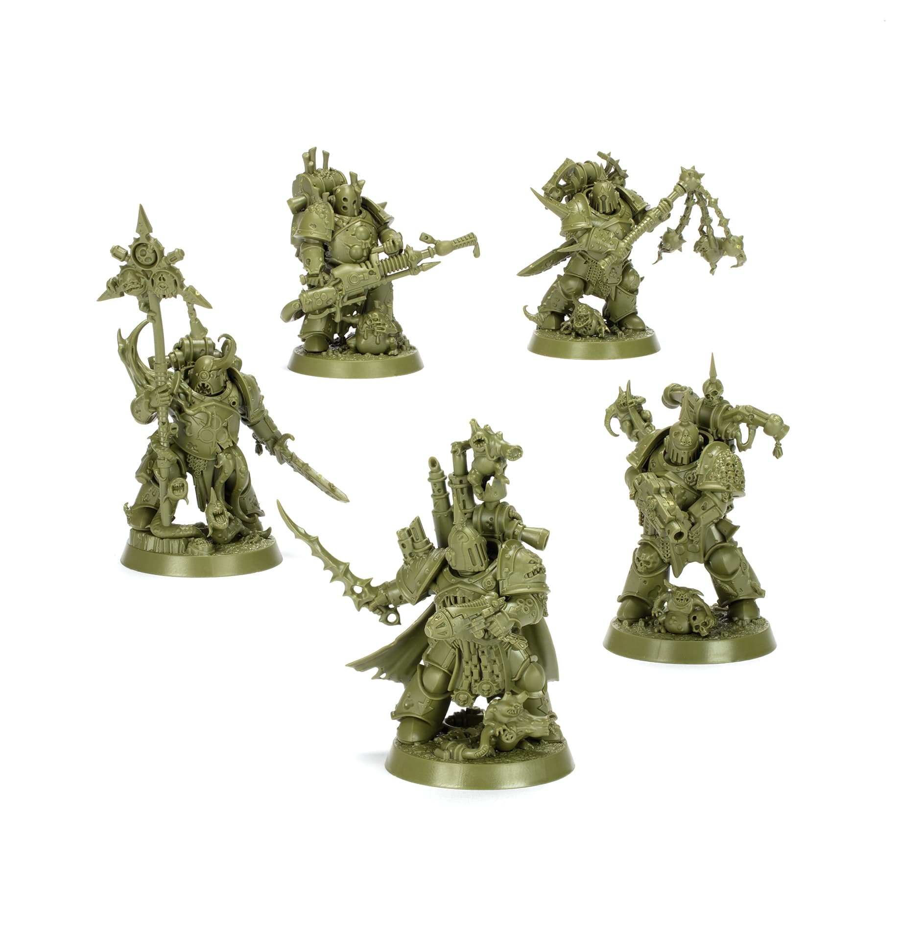 – Fünf Krieger der Death Guard – verdorbene Space Marines, die Nurgle verehren, den Chaosgott der Seuchen und Pestilenz. Sie können Schmerzen aushalten, die einen Sterblichen in die Knie zwingen würden, und ihre Waffen können jeden Feind vergiften. Sie sind aus grünem Kunststoff und können ohne Werkzeug gebaut werden.