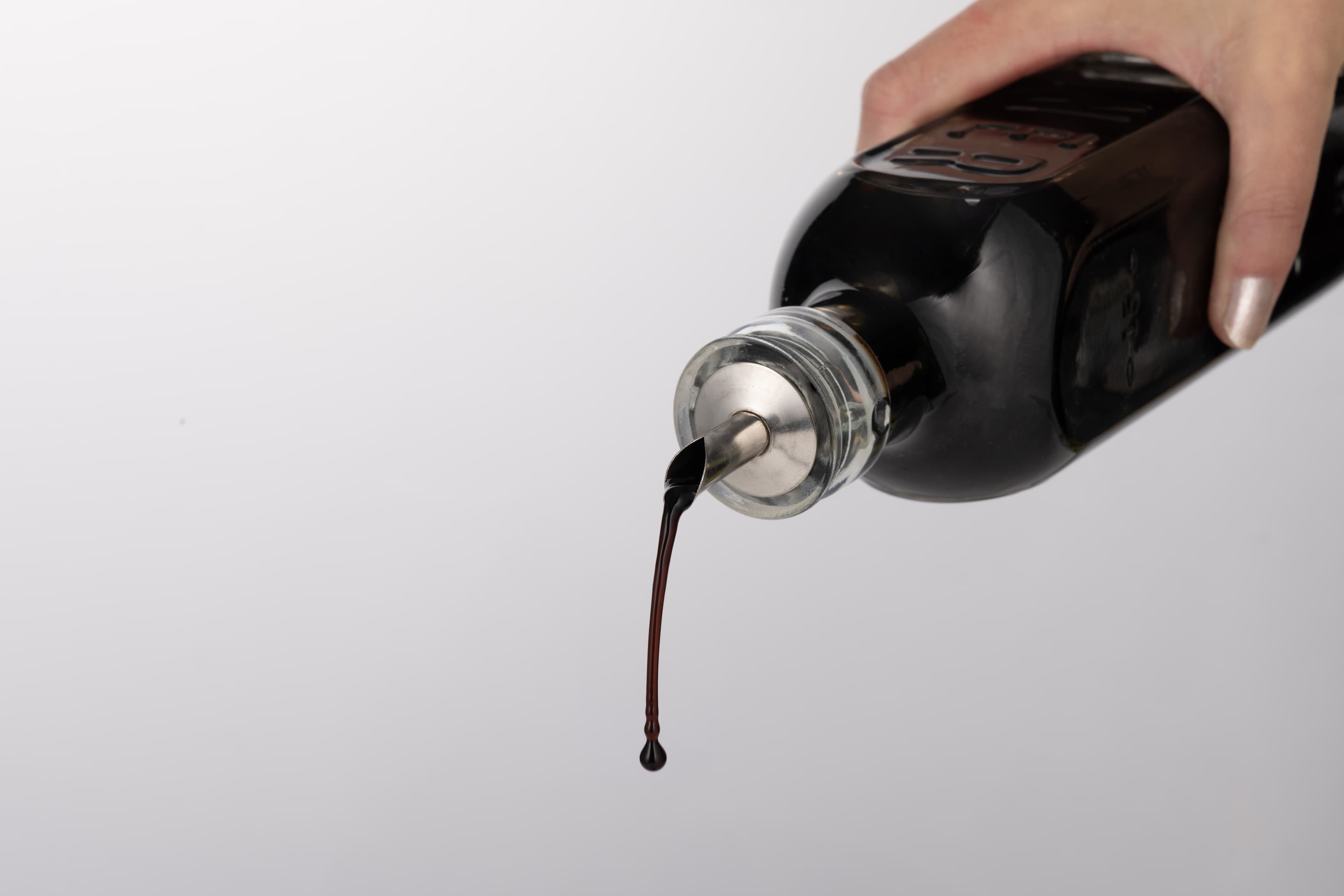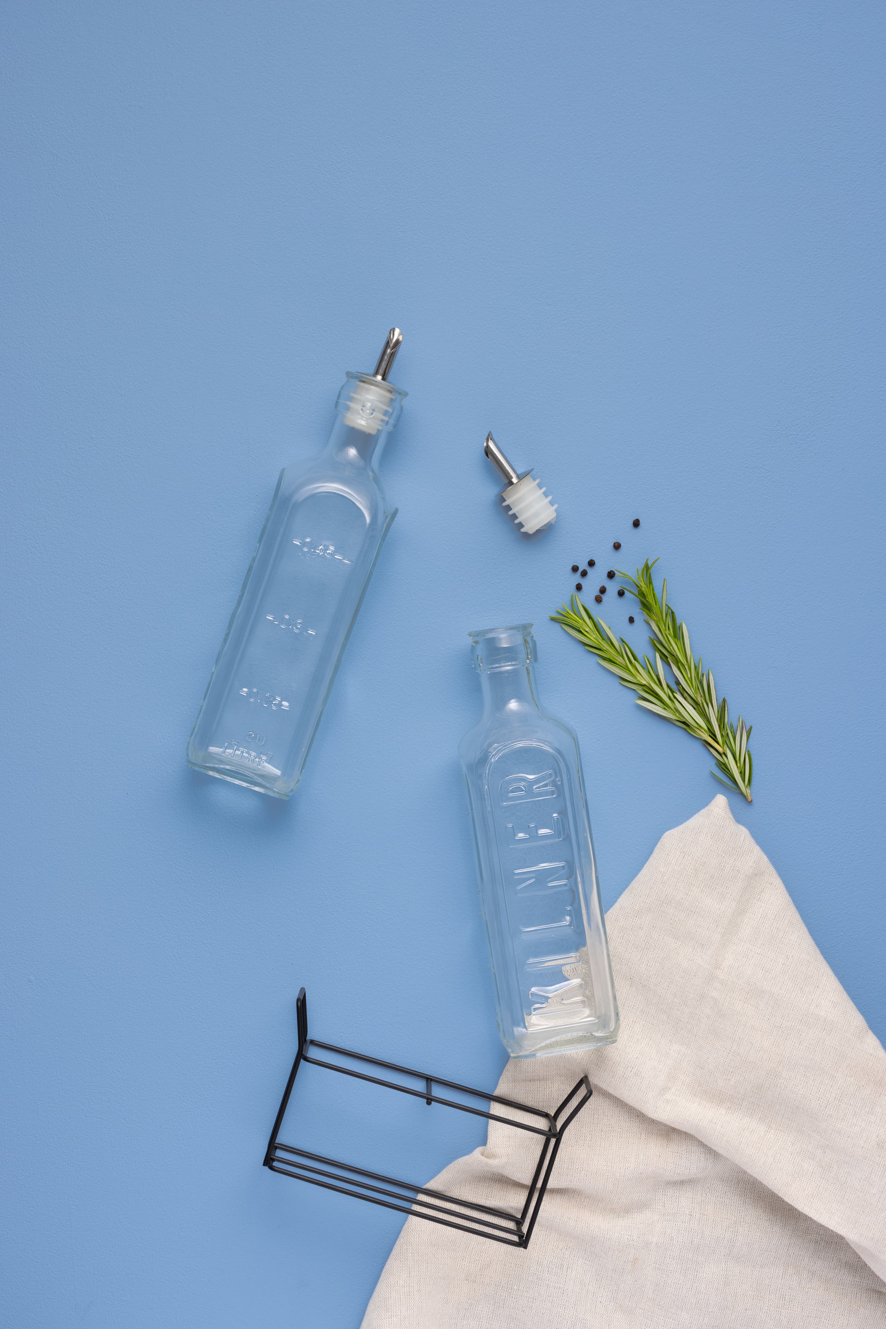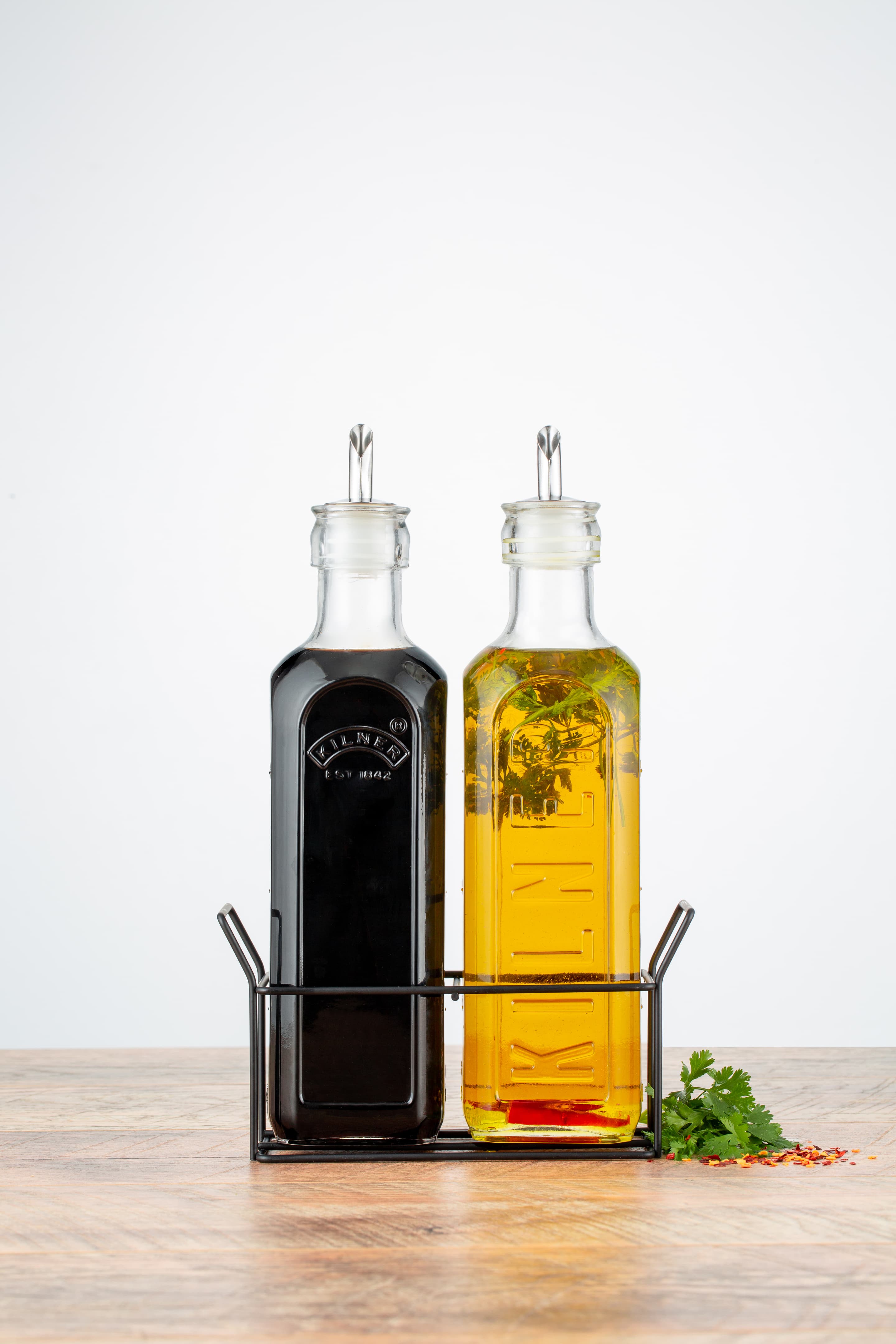 Formschönes Menage-Set für Öl- und Essig in passendem Metallständer.