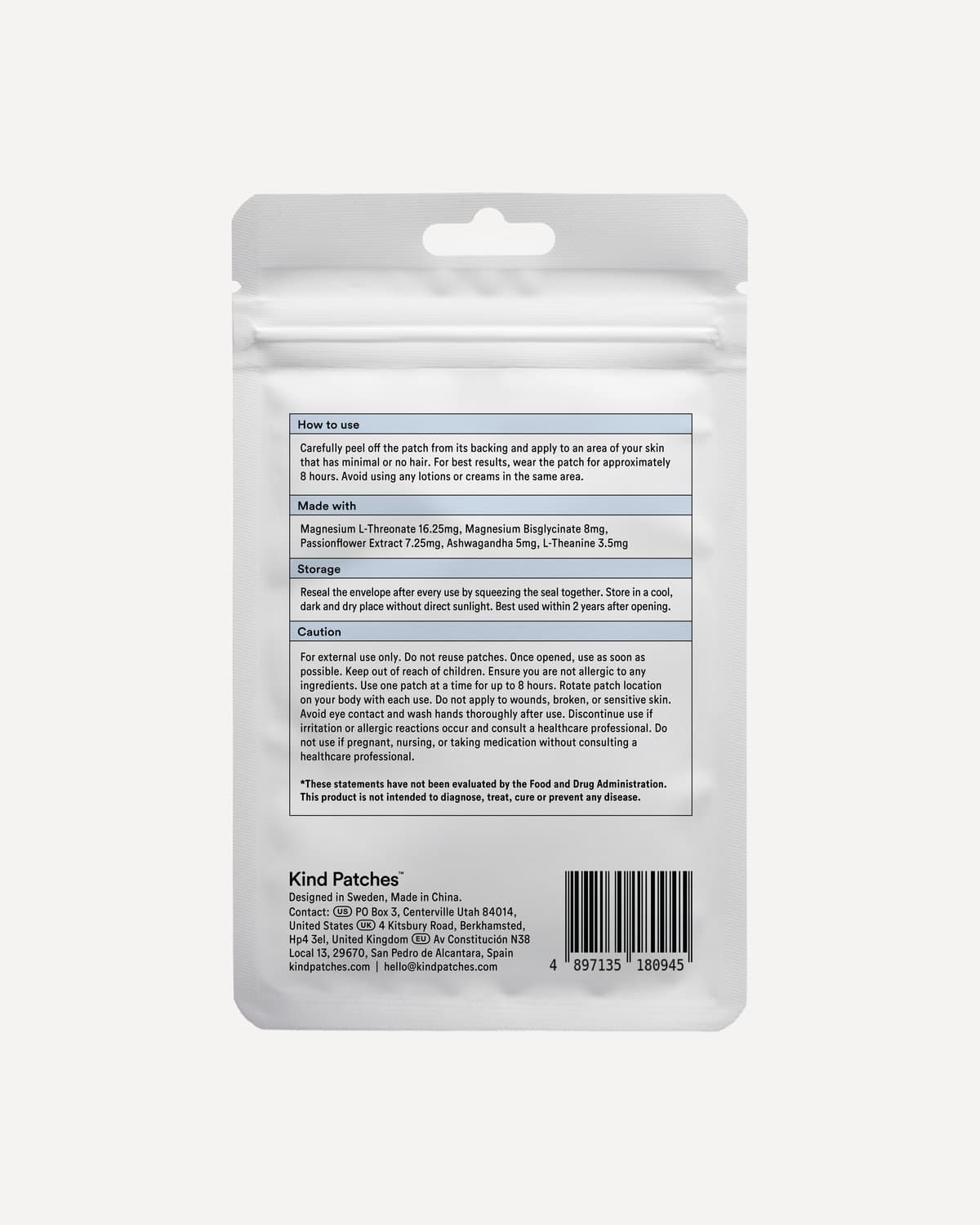 | Nutzungshinweis | Durch die Unterstützung der natürlichen Ruheprozesse des Körpers helfen Dream Patches™ Magnesium, einen tieferen, erholsameren Schlaf zu fördern und ein ausgeglicheneres Wohlbefinden zu erreichen. Magnesium L-Threonat (16,25 mg): Bekannt dafür, die Blut-Hirn-Schranke zu überwinden, wird diese Form von Magnesium geschätzt, weil sie die kognitive Funktion unterstützt, Entspannung fördert und erholsamen Schlaf begünstigt. Magnesium Bisglycinat (8 mg): Eine sanfte, gut aufnehmbare Form von Magnesium, die häufig gewählt wird, um Muskelentspannung, Ruhe und gesunde Schlafmuster zu unterstützen. Passionsblumen-Extrakt (7,25 mg): Traditionell zur Linderung von Unruhe eingesetzt, wird Passionsblume in der Kräuterheilkunde geschätzt, da sie Entspannung fördert und tiefen, natürlichen Schlaf unterstützt. Ashwagandha (5 mg): Ein in der Ayurveda-Tradition hochgeschätztes Adaptogen, das dem Körper hilft, sich an Stress anzupassen, und gleichzeitig einen ruhigen Geist sowie erholsamen Schlaf unterstützt. L-Theanin (3,5 mg): Eine Aminosäure, die in grünem Tee vorkommt. L-Theanin wird geschätzt, weil es Entspannung fördert, ohne Müdigkeit zu verursachen, und so zu einem ausgeglichenen, erholsamen Zustand beiträgt. |