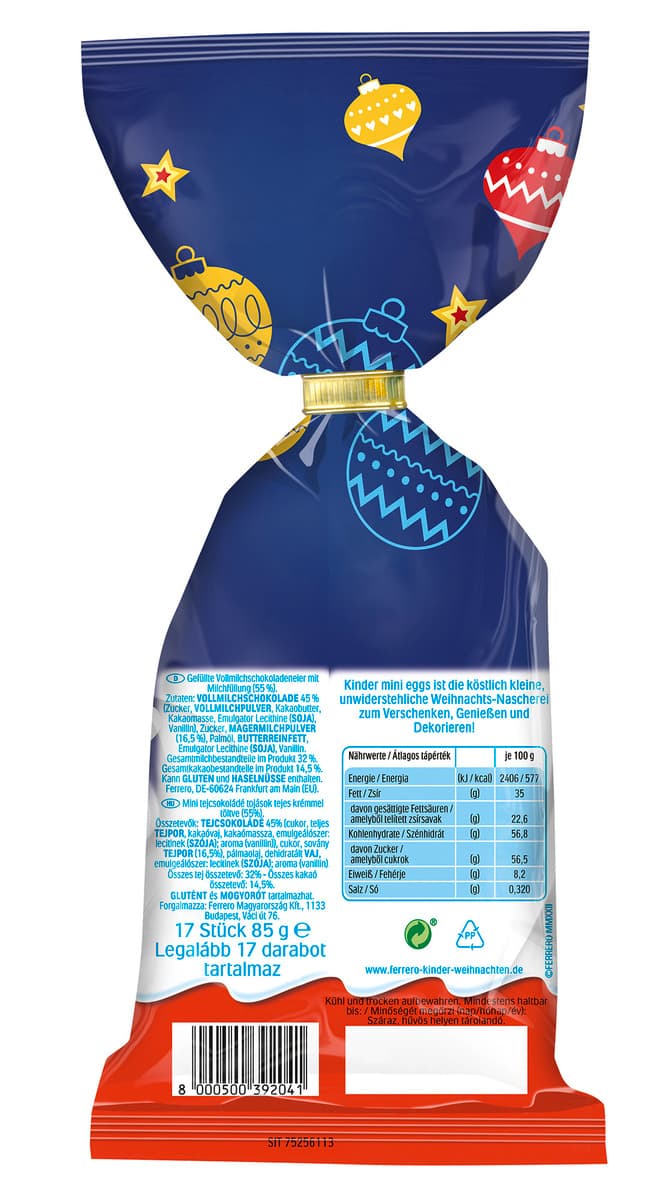 | Zutaten | VOLLMILCHSCHOKOLADE 45 % (Zucker, VOLLMILCHPULVER, Kakaobutter, Kakaomasse, Emulgator Lecithine (SOJA), Vanillin), Zucker, MAGERMILCHPULVER (16,5 %), Palmöl, BUTTERREINFETT, Emulgator Lecithine (SOJA), Vanillin. Gesamtmilchbestandteile im Produkt 32 %. Kann GLUTENHALTIGES Getreide, EIER, MANDELN, HASELNÜSSE und PISTAZIEN enthalten. |