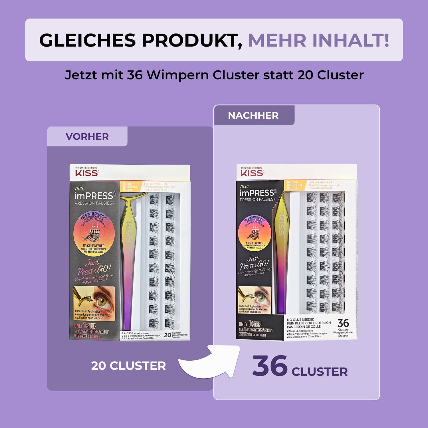 Wimpern OHNE KLEBER in nur einem Schritt - einfach die imPRESS Falsies Cluster unter die eigenen Wimpern andrücken und fertig ist der Look! Die neuen imPRESS Press-on Falsies mit der selbstklebenden Technologie sind eine echte Innovation im Bereich künstliche Wimpern. Jetzt mir mehr Inhalt!