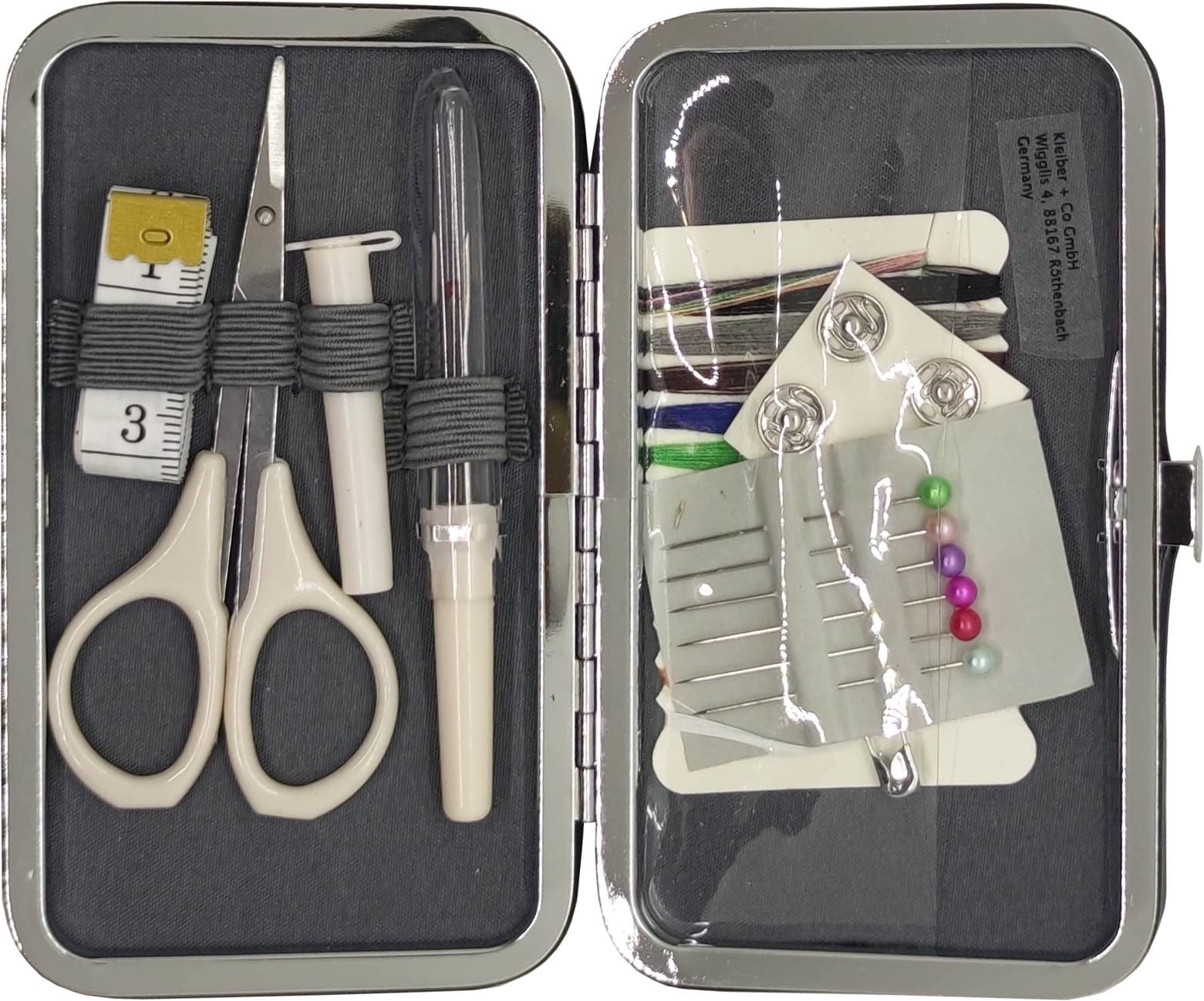 Inhalt: 1 Schere, 1 Faden- und Nahttrenner, 1 Maßband 150 cm, 4 Druckknöpfe, Hemdenknöpfe, Fäden farblich sortiert,6 Buntkopf-Stecknadeln, 6 Sicherheitsnadeln Größe: 12 cm x 7 cm x 1,5 cm (geschlossen)