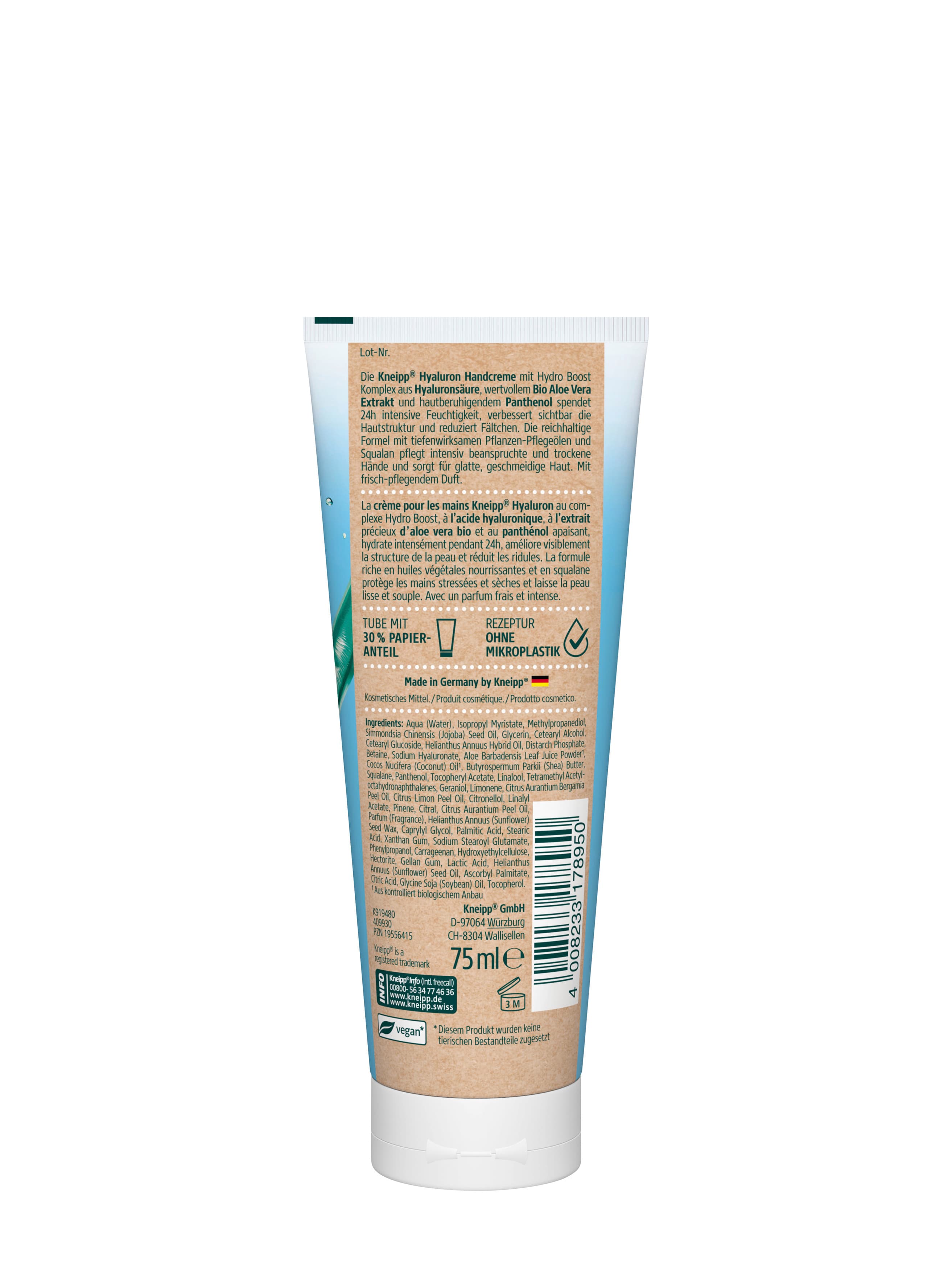 Die Kneipp® Hyaluron Handcreme mit Hydro Boost Komplex aus Hyaluronsäure, wertvollem Bio Aloe Vera Extrakt und hautberuhigendem Panthenol spendet 24h intensive Feuchtigkeit, verbessert sichtbar die Hautstruktur und reduziert Fältchen. Die reichhaltige Formel mit tiefenwirksamen Pflanzen-Pflegeölen und Squalan pflegt intensiv beanspruchte und trockene Hände und sorgt für glatte, geschmeidige Haut. Mit frisch-pflegendem Duft. Kosmetisches Mittel.
