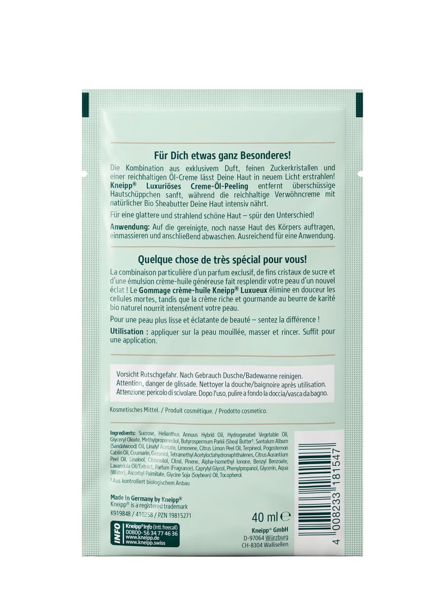 Für Dich etwas ganz Besonderes! Die Kombination aus exklusivem Duft, feinen Zuckerkristallen und einer reichhaltigen Öl-Creme lässt Deine Haut in neuem Licht erstrahlen! Kneipp® Luxuriöses Creme-Öl-Peeling entfernt überschüssige Hautschüppchen sanft, während die reichhaltige Verwöhncreme mit natürlicher Bio Sheabutter Deine Haut intensiv nährt. Für eine glattere und strahlend schöne Haut – spür den Unterschied! Kosmetisches Mittel.