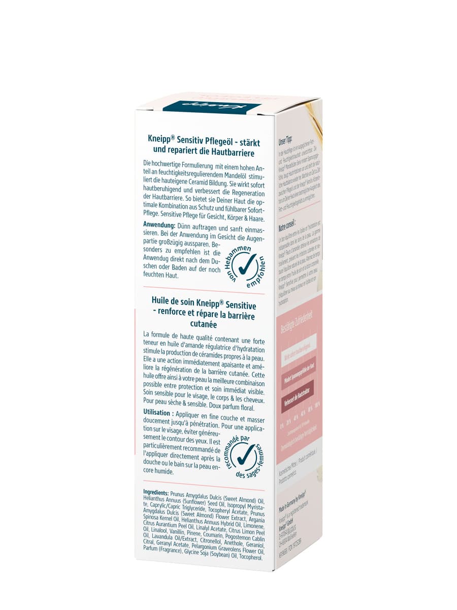 Kneipp® Sensitiv Pflegeöl – stärkt und repariert die Hautbarriere Die hochwertige Formulierung mit einem hohen Anteil an feuchtigkeitsregulierendem Mandelöl stimuliert die hauteigene Ceramid Bildung. Sie wirkt sofort hautberuhigend und verbessert die Regeneration der Hautbarriere. So bietet sie Deiner Haut die optimale Kombination aus Schutz und fühlbarer Sofort- Pflege. Sensitive Pflege für Gesicht, Körper & Haare. Mit hochwertigen Pflanzen-Pflegeölen Unsere Pflegeöle enthalten einen hohen Anteil an pflanzlichen pflegenden Ölen sowie zellschützendes Vitamin E. Das wertvolle Mandelöl verfügt über einen besonders hohen Gehalt an essentiellen Fettsäuren. Es pflegt die Haut intensiv und unterstützt die natürliche Regulierung der Hautfeuchtigkeit. Sonnenblumenöl wird in Hautpflegeprodukten aufgrund seiner hervorragenden pflegenden Eigenschaften sowie der sehr guten Verträglichkeit eingesetzt. Unser Tipp: In der Hautpflege ist ein ausgeglichener Fett- und Feuchtigkeitshaushalt unverzichtbar. Die Kneipp® Mandelblüten Serie mindert Spannungsgefühle, beugt Hautirritationen vor und stellt die natürliche Hautbalance wieder her. Wechsle von Zeit zu Zeit zwischen Pflegeöl und der Kneipp® Sensitiv Körperlotion um Deiner Haut einen bestmöglichen Ausgleich des Fett- und Feuchtigkeitsgehalts zu ermöglichen. Seit 1891 stellt Kneipp® zeitgemäße Produkte für Gesundheit und Wohlbefinden her. Pflanzenkompetenz und pharmazeutische Erfahrung, modernste Produktionsverfahren sowie sorgfältige wissenschaftliche Kontrollen bürgen für seit Generationen bewährte Qualität. Bestätigte Zufriedenheit Wirkt sofort hautberuhigend Mindert Spannungsgefühle der Haut Verbessert die Hautstruktur Dermatologisch bestätigte Verträglichkeit Kosmetisches Mittel.