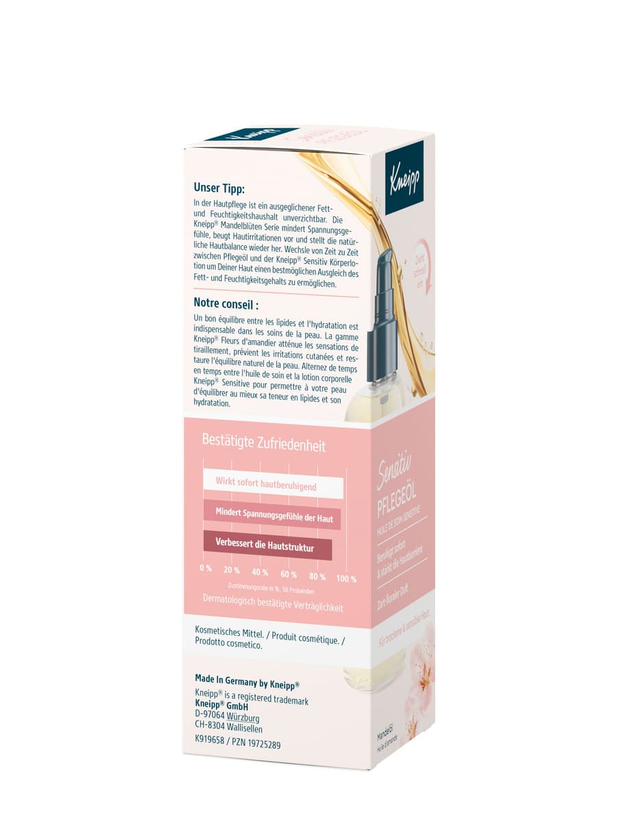 AnwendungshinweisDünn auftragen und sanft einmassieren. Bei der Anwendung im Gesicht die Augenpartie großzügig aussparen. Besonders zu empfehlen ist die Anwendung direkt nach dem Duschen oder Baden auf der noch feuchten Haut. Unser Tipp: In der Hautpflege ist ein ausgeglichener Fett- und Feuchtigkeitshaushalt unverzichtbar. Die Kneipp® Mandelblüten Serie mindert Spannungsgefühle, beugt Hautirritationen vor und stellt die natürliche Hautbalance wieder her. Wechsle von Zeit zu Zeit zwischen Pflegeöl und der Kneipp® Sensitiv Körperlotion um Deiner Haut einen bestmöglichen Ausgleich des Fett- und Feuchtigkeitsgehalts zu ermöglichen.