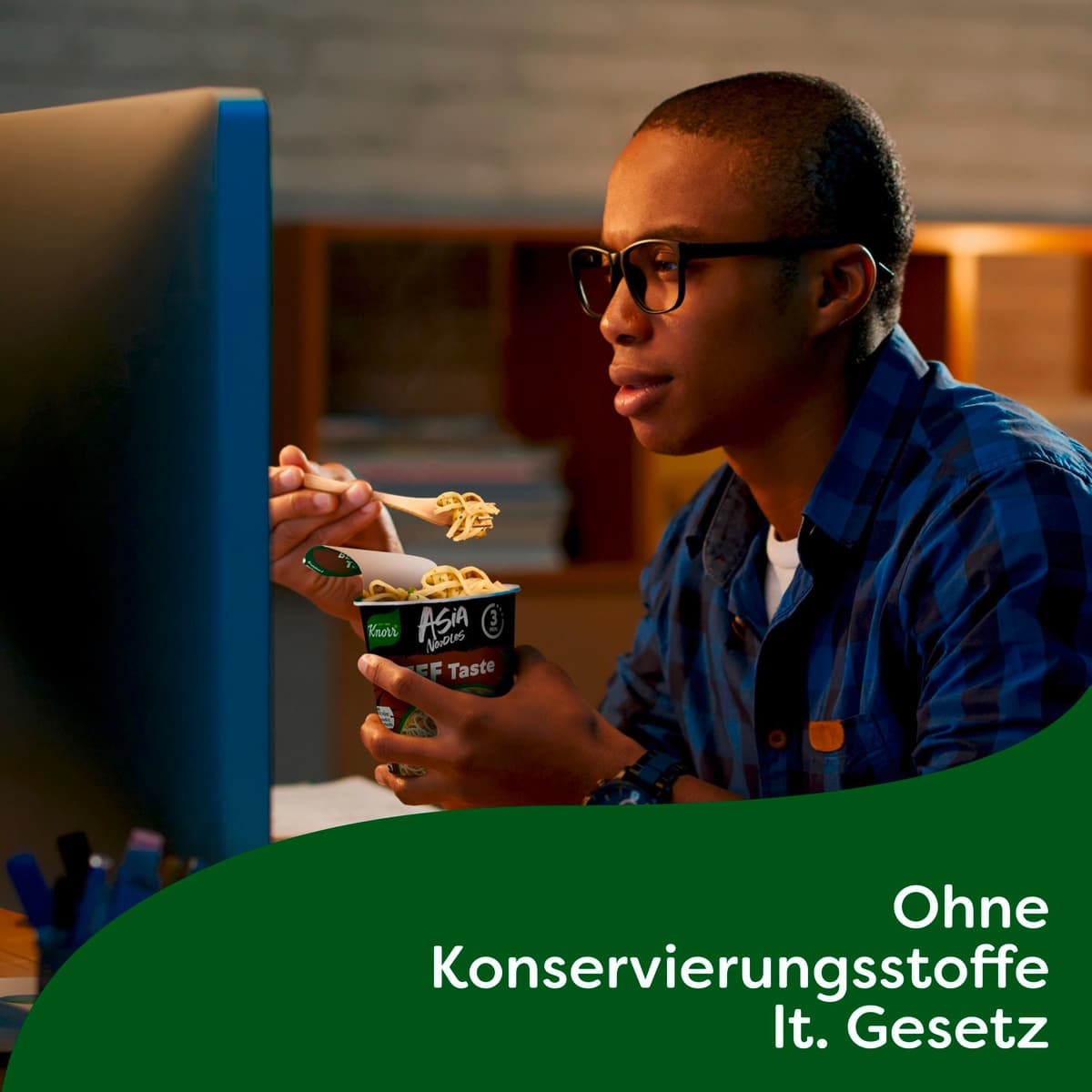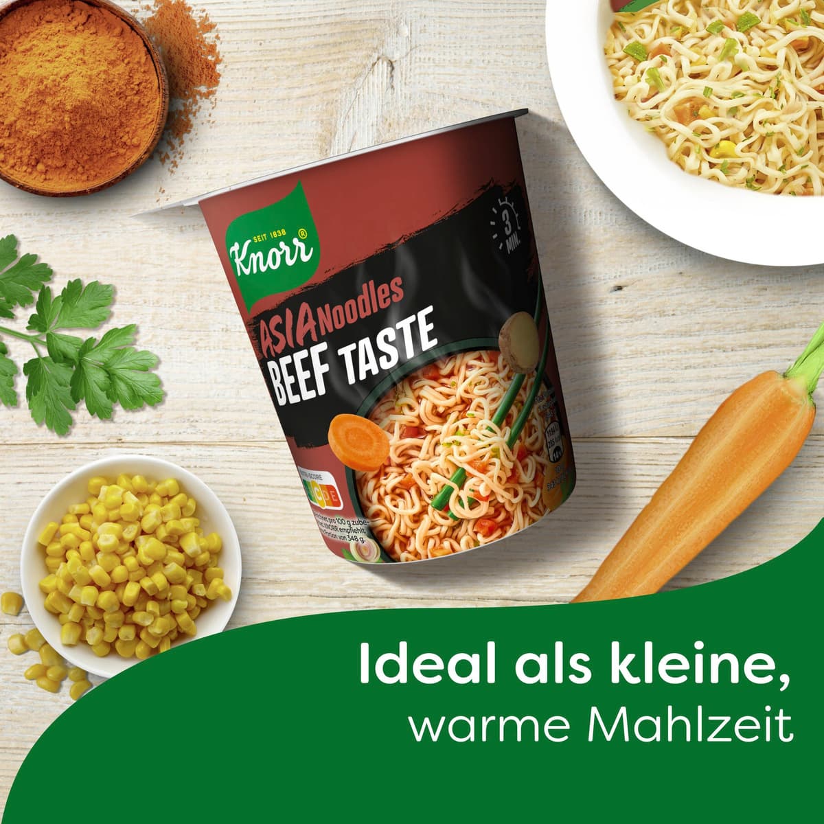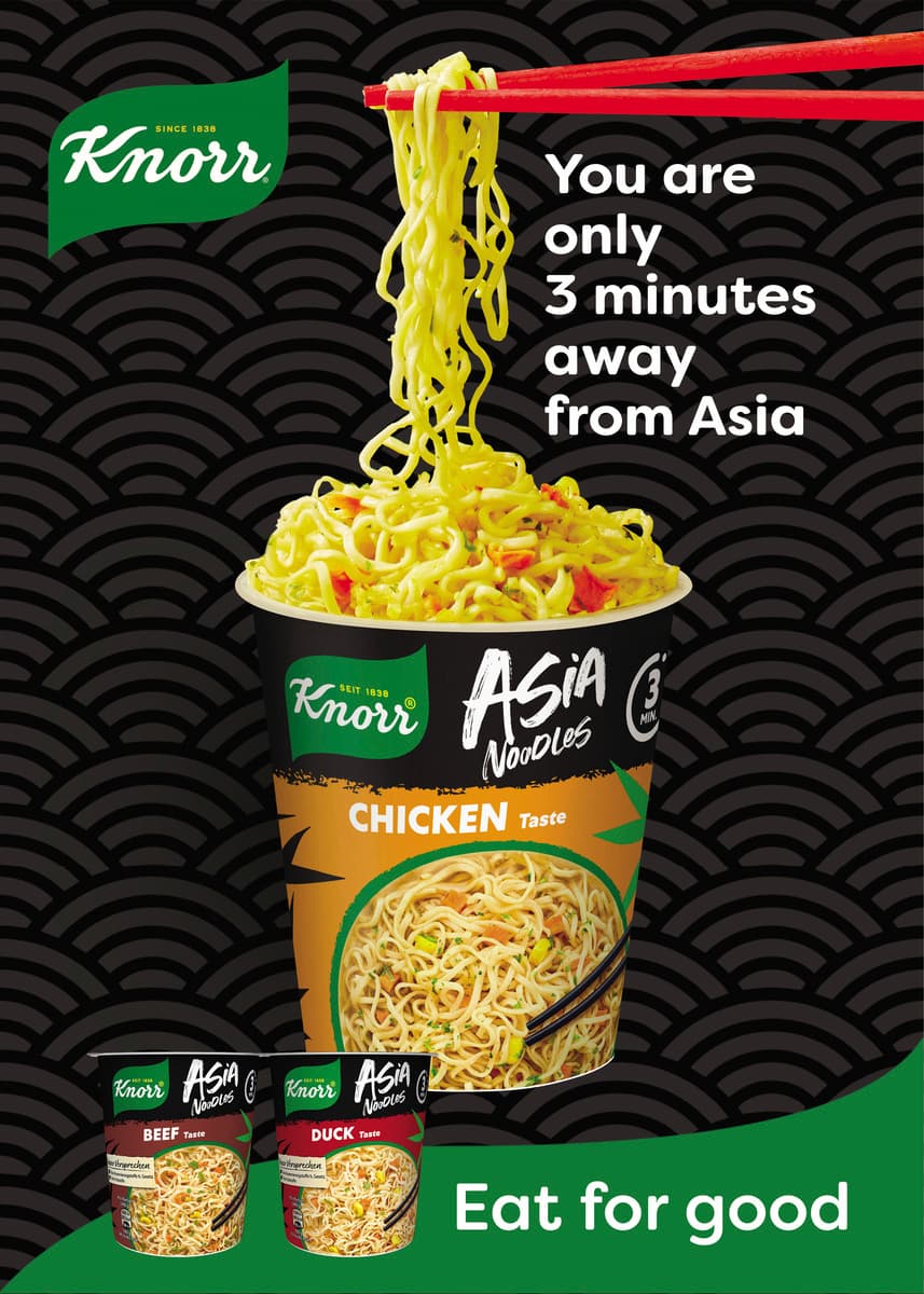 Die Knorr Asia Noodles Beef Taste ist die schnelle kleine Mahlzeit für das Büro oder wenn zu Hause mal keine Zeit zum Kochen ist. Dabei wird der Becher mit heißem Wasser aufgegossen und innerhalb von nur 3 Minuten ist das Fertiggericht zubereitet. Fix gemacht und einfach lecker. Zubereitung: Deckel öffnen und mit kochendem Wasser bis zur Markierung aufgießen. Gründlich umrühren und Deckel wieder schließen. Den Snack Pot 3 Minuten ziehen lassen. Nochmals gut umrühren und in wenigen Minuten ist ein leckeres Nudelgericht fertig. In unserem vielfältigen Sortiment haben wir cremige Pasta Snacks und herzhafte Kartoffel Snacks. Auch die Liebhaber von Reis-Snacks kommen mit dem exotischen Curry-Reis schnell auf den Geschmack. Abwechslung bietet neben dem Vollkorn Pasta Snack Tomate & Speck auch ein Sortiment von authentisch asiatischen Instant Nudeln. Einfach mal eine Auszeit mit den leckeren Snackbechern oder Fertignudeln von Knorr nehmen. Knorr verarbeitet nur sorgfältig schonend getrocknete Zutaten, denn das Trocknen ist eine der ältesten Methoden, um Lebensmittel natürlich haltbar zu machen. Da der Geschmack und die Nährstoffe der frischen Zutaten weitgehend erhalten bleiben, passen Lebensmittel aus getrockneten Zutaten perfekt in unseren stressigen Alltag. Essen mit Knorr ist unkompliziert und sorgt darüber hinaus für ein gutes Gefühl: Über 90 Prozent der Zutaten kommen heute schon aus nachhaltigem Anbau. Denn wir bei Knorr glauben, dass die Verwendung nachhaltig angebauter und beschaffter Zutaten einen großen Unterschied für den Geschmack unserer Produkte, das Wohlbefinden der Landwirte und die Zukunft des Planeten macht. Knorr – Gutes über den Becherrand hinaus.