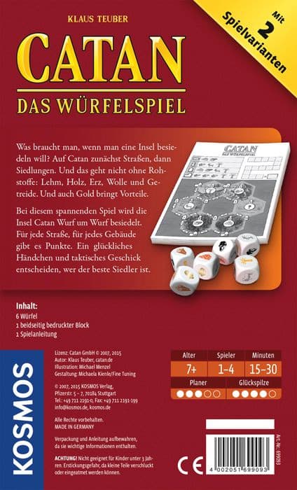 Was braucht man, wenn man eine Insel besiedeln will? Auf Catan zunächst Straßen, dann Siedlungen. Und das geht nicht ohne Rohstoffe: Lehm und Holz, Erz und Wolle. Getreide braucht man zum Essen – und wer viel Glück hat, findet Gold. Bei diesem lockeren Würfelspiel wird die Insel Catan Wurf um Wurf besiedelt. Für jede Straße, für jedes Gebäude gibt es Punkte. Ein glückliches Händchen und taktisches Geschick entscheiden, wer der beste Siedler ist. Hier kann jedem der große Wurf gelingen!