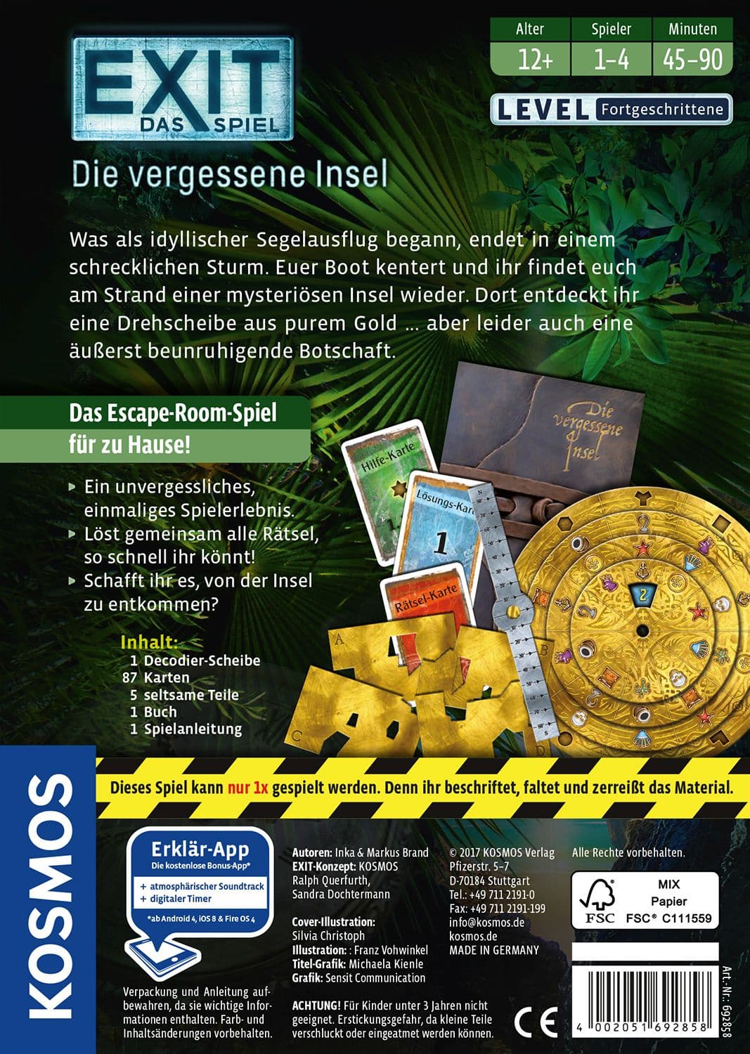 Bei „EXIT - Das Spiel“ entdecken die Spieler mit etwas Kombinationsgabe, Teamgeist und Kreativität nach und nach immer mehr Gegenstände, knacken Codes, lösen Rätsel und kommen der Freiheit Stück für Stück näher. Dabei müssen auch ungewöhnliche Wege beschritten werden. So darf das Material geknickt, beschriftet oder zerrissen werden. Ist das Geheimnis der Insel einmal gelüftet, kann das Event-Spiel kein zweites Mal gespielt werden. Das macht den Spieleabend zu einem besonderen Highlight.