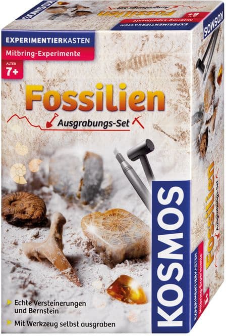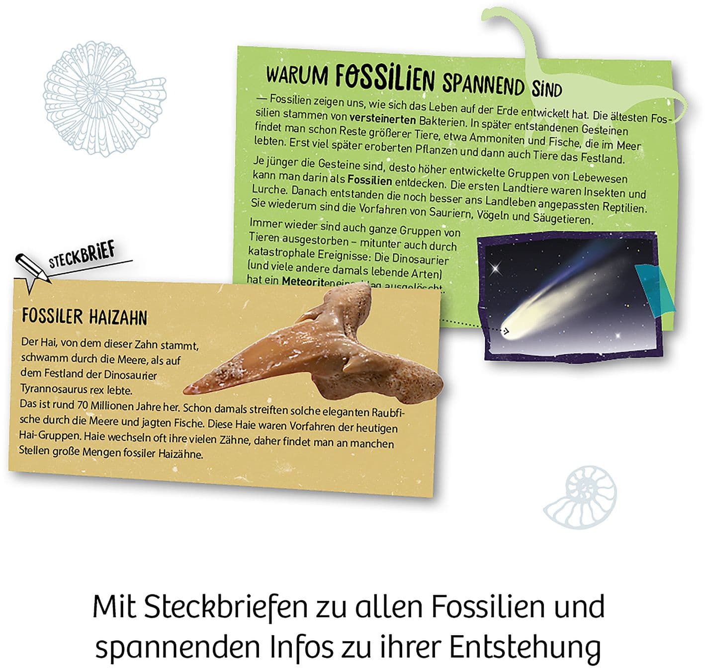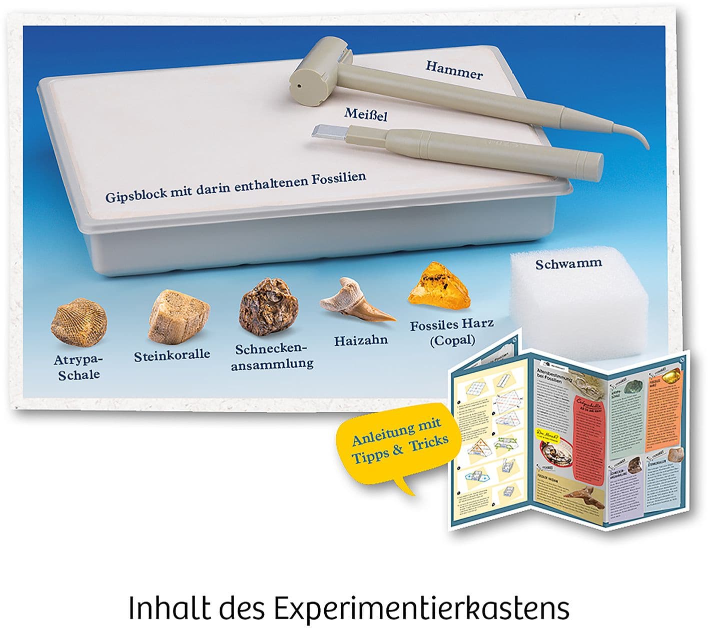Graben, entdecken, staunen – mit diesem Set geht’s auf eine spannende Zeitreise! Einfach unglaublich, dass sich echte Fossilien, wie Haizahn, Steinkoralle, Atrypa-Schale, Schnecken und Bernstein in diesem Gips-Ausgrabungsblock verstecken. Mit Hammer und Meißel graben sich kleine Urzeit-Forscher behutsam durch die unterschiedlichen Gipsschichten. Das geht ganz einfach mit der Anleitung: Sie erklärt den Kindern, wie sie bei ihren Erkundungen am besten vorgehen und beantwortet viele Fragen, die beim Spielen rund um das Thema Fossilien entstehen. Die tollen Fossilien-Funde sollen natürlich auch Freunde, Geschwister und Eltern bewundern! Im Handumdrehen sind schöne Präsentationsschachteln gebastelt, die das Kinderzimmer in ein kleines Museum verwandeln.