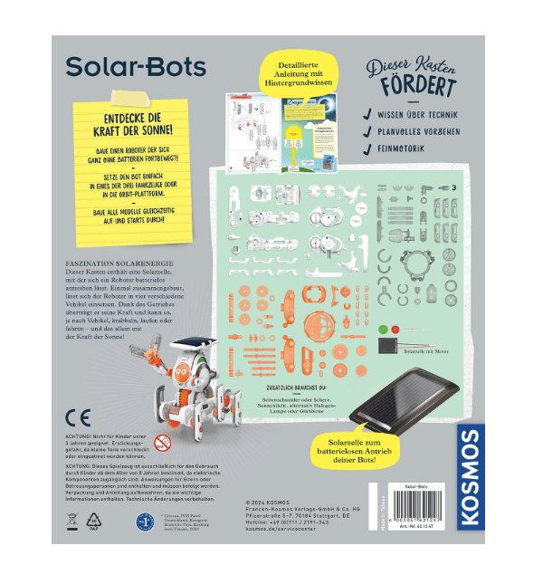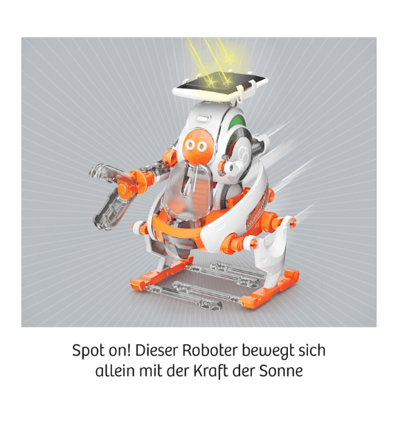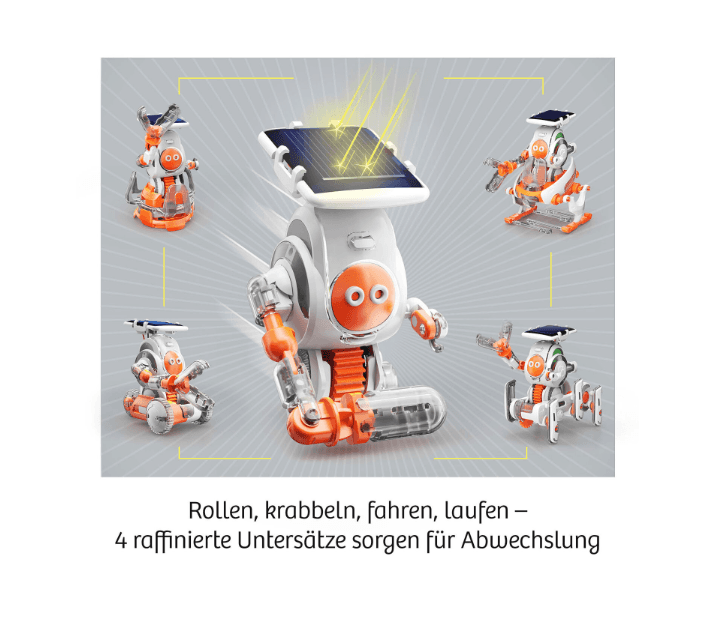Dieses kleine Energiebündel rollt, krabbelt, fährt oder läuft mit der Kraft der Sonne! Einmal zusammengebaut, lässt sich der Solar Bot von KOSMOS auf vier verschiedene Untersätze klicken und kann sich so auf ganz unterschiedliche Arten fortbewegen. Und das alles ohne Batterien, denn ein Solarpanel und ein Getriebe sorgen dafür, dass die Energie der Sonne genutzt und in eine Bewegung umgewandelt wird.