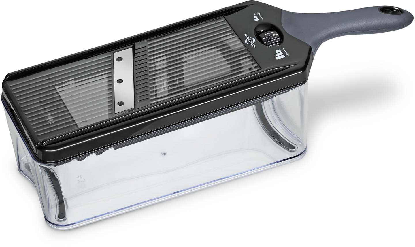 Dank des seitlich angebrachten Rädchens lässt sich die gewünschte Dicke der Scheiben einfach und stufenlos einstellen. Das geschnittene Gut fällt direkt in den transparenten Behälter, was die Weiterverarbeitung erleichtert und die Küche sauber hält. Die robuste Konstruktion aus hochwertigem Kunststoff sorgt für Stabilität bei der Anwendung.