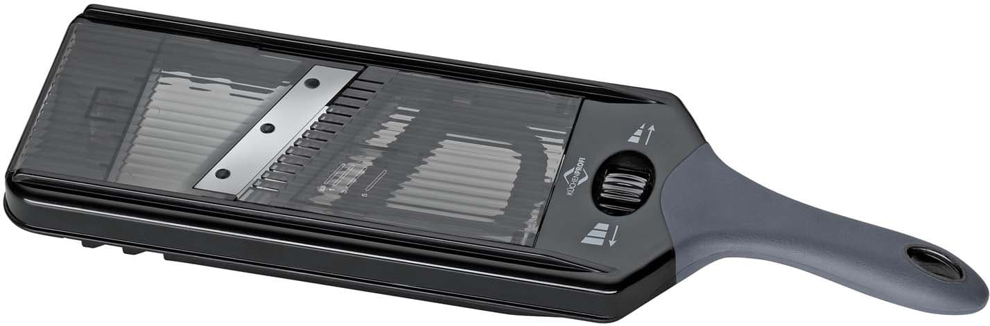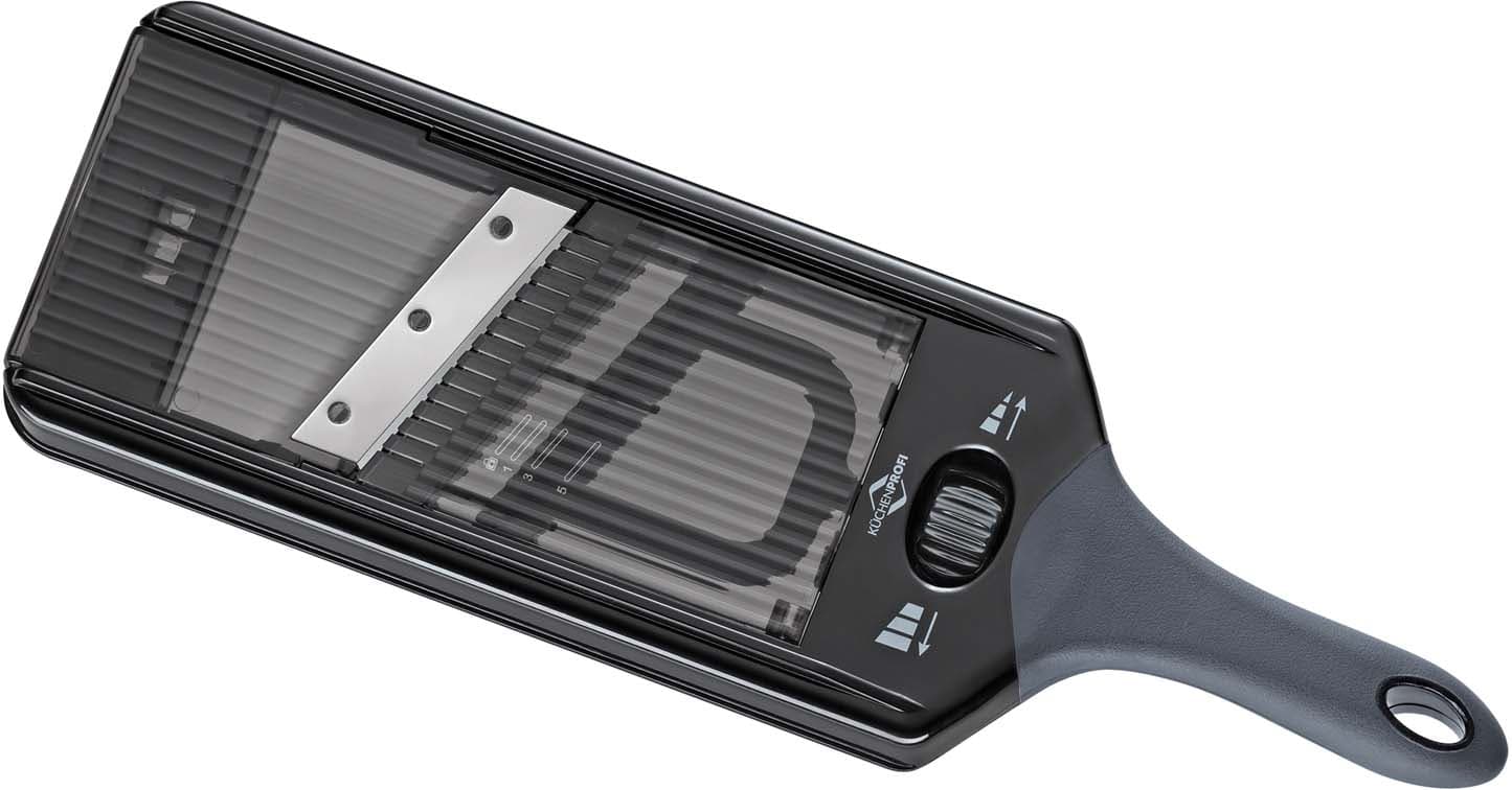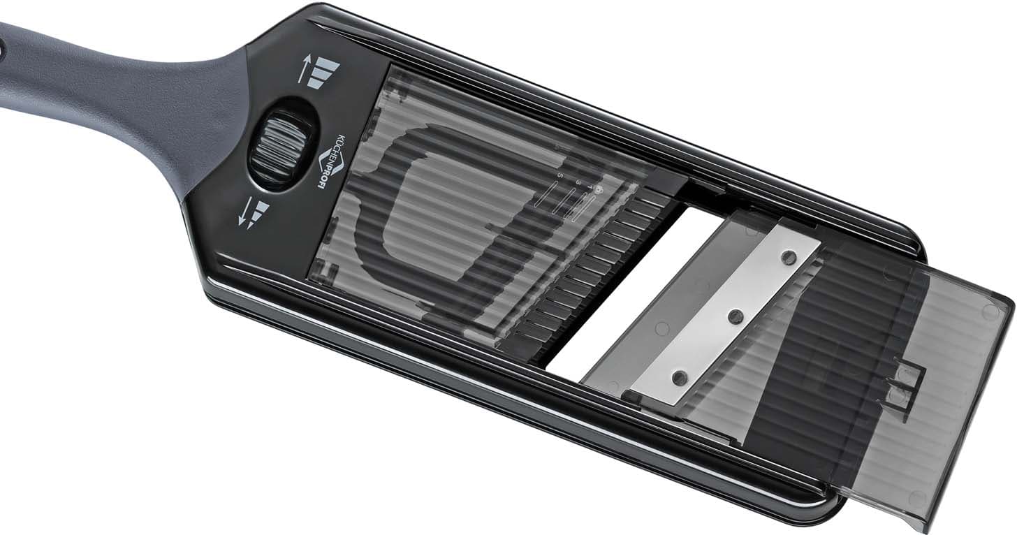 Der Gemüsehobel Vario von KÜCHENPROFI erleichtert das präzise Schneiden von Obst und Gemüse für eine Vielzahl von Gerichten. Mit diesem praktischen Küchenhelfer gelingen gleichmäßige Scheiben im Handumdrehen.