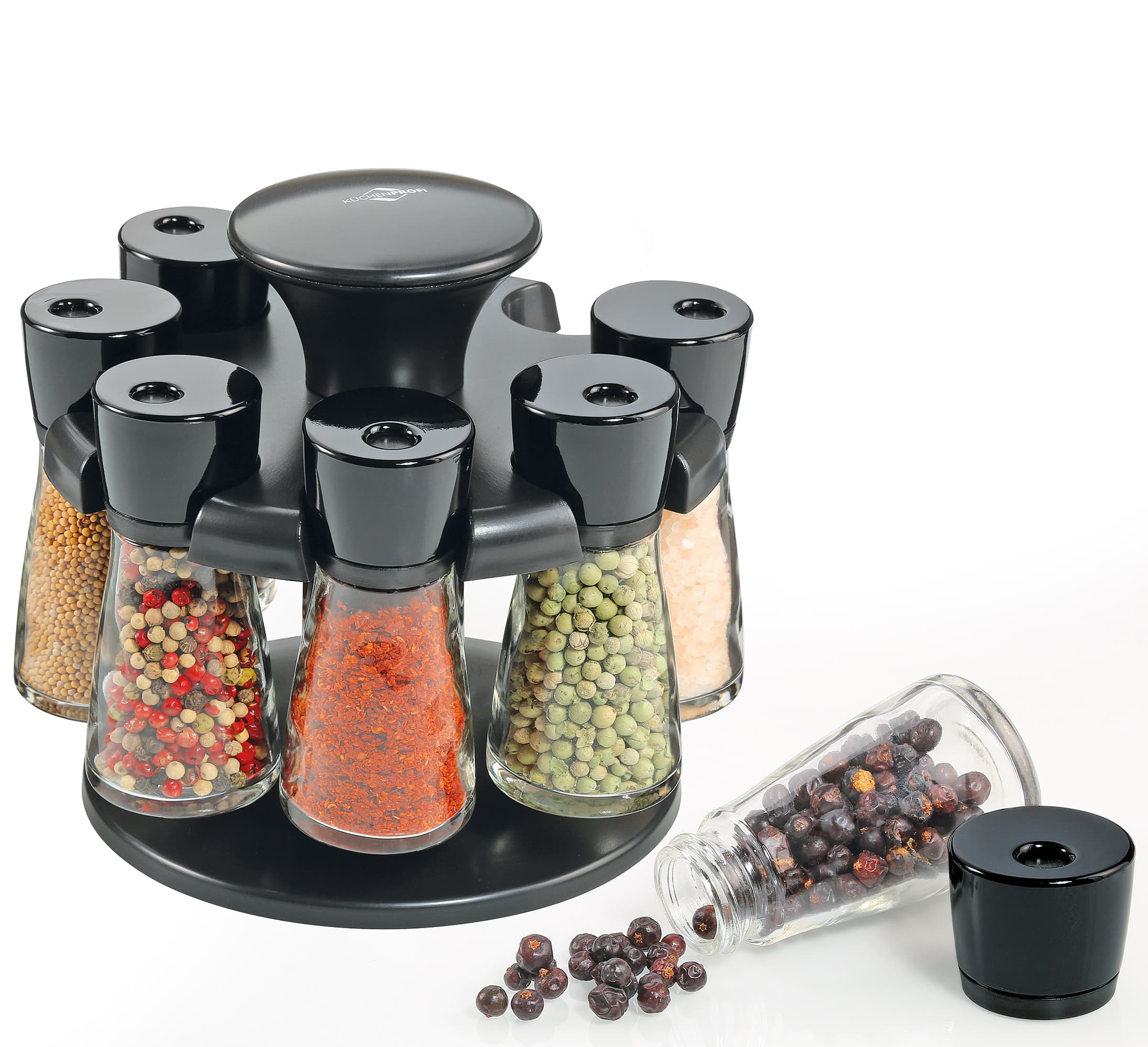 Da drehen bunter Pfeffer, Curry, getrockneter Oregano, Paprikapulver &. Co. gerne eine Runde. Acht Kräuter und Gewürze finden auf dem Gewürzkarussell RONDO von KÜCHENPROFI Platz. In den Gläsern sind sie gut aufgehoben, die fest schließenden Deckel mit 3-fach verstellbarer Dosierwahl bewahren das Aroma. Und Sie haben die Geschmacksträger beim Kochen stets griffbereit. Das Gewürzkarussell ist kompakt gebaut, beansprucht daher auf der Arbeitsfläche nur wenig Platz. Es sorgt für Ordnung in der Küche und ist ein schönes Starter-Geschenk für die erste eigene Wohnung. Vielleicht mit einer selbstgemachten Gewürzmischung? Beschreibbare Aufkleber liegen dem Gewürzkarussell bei.
