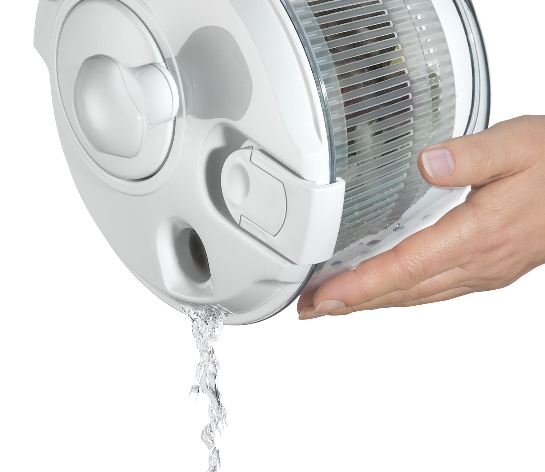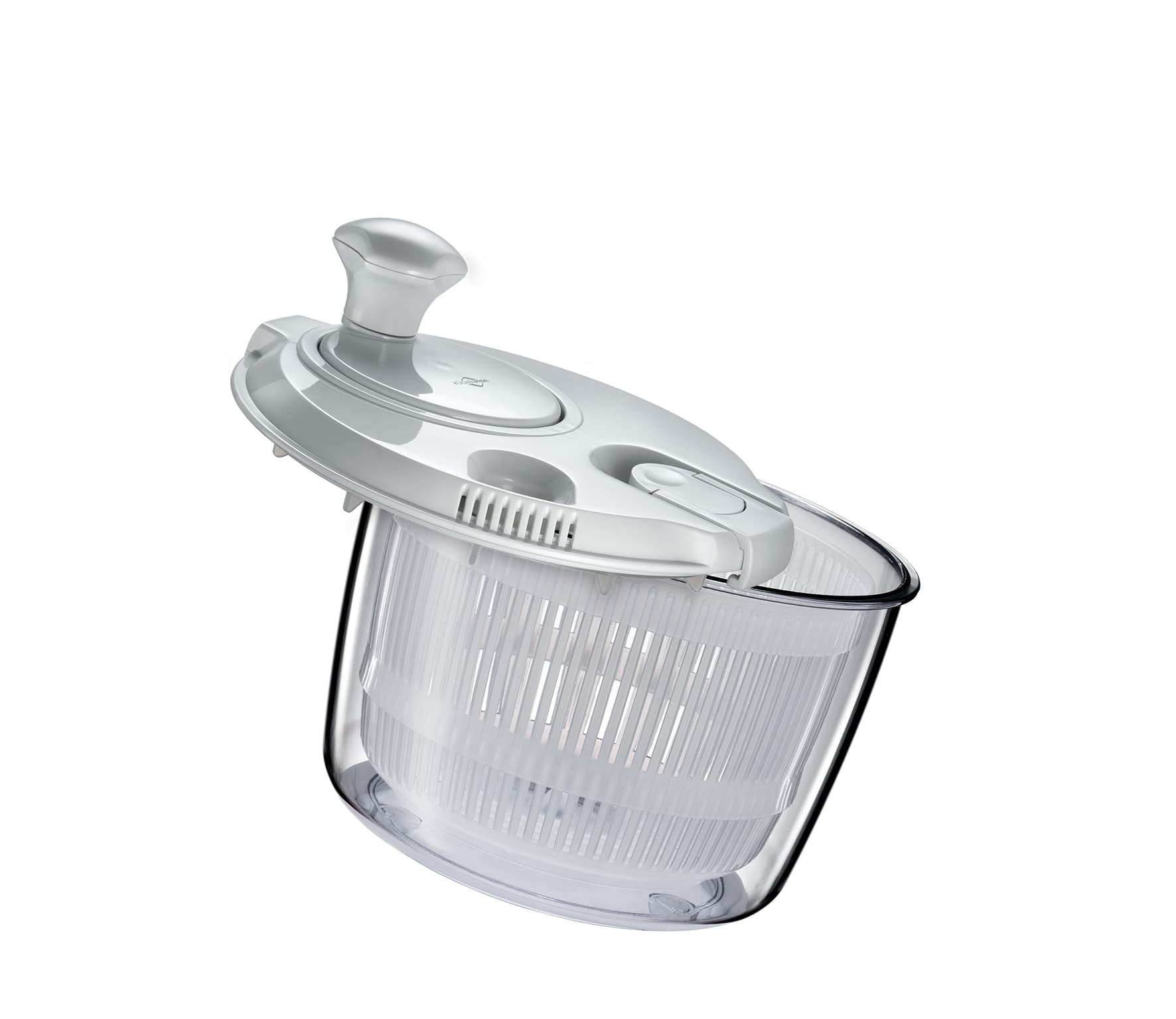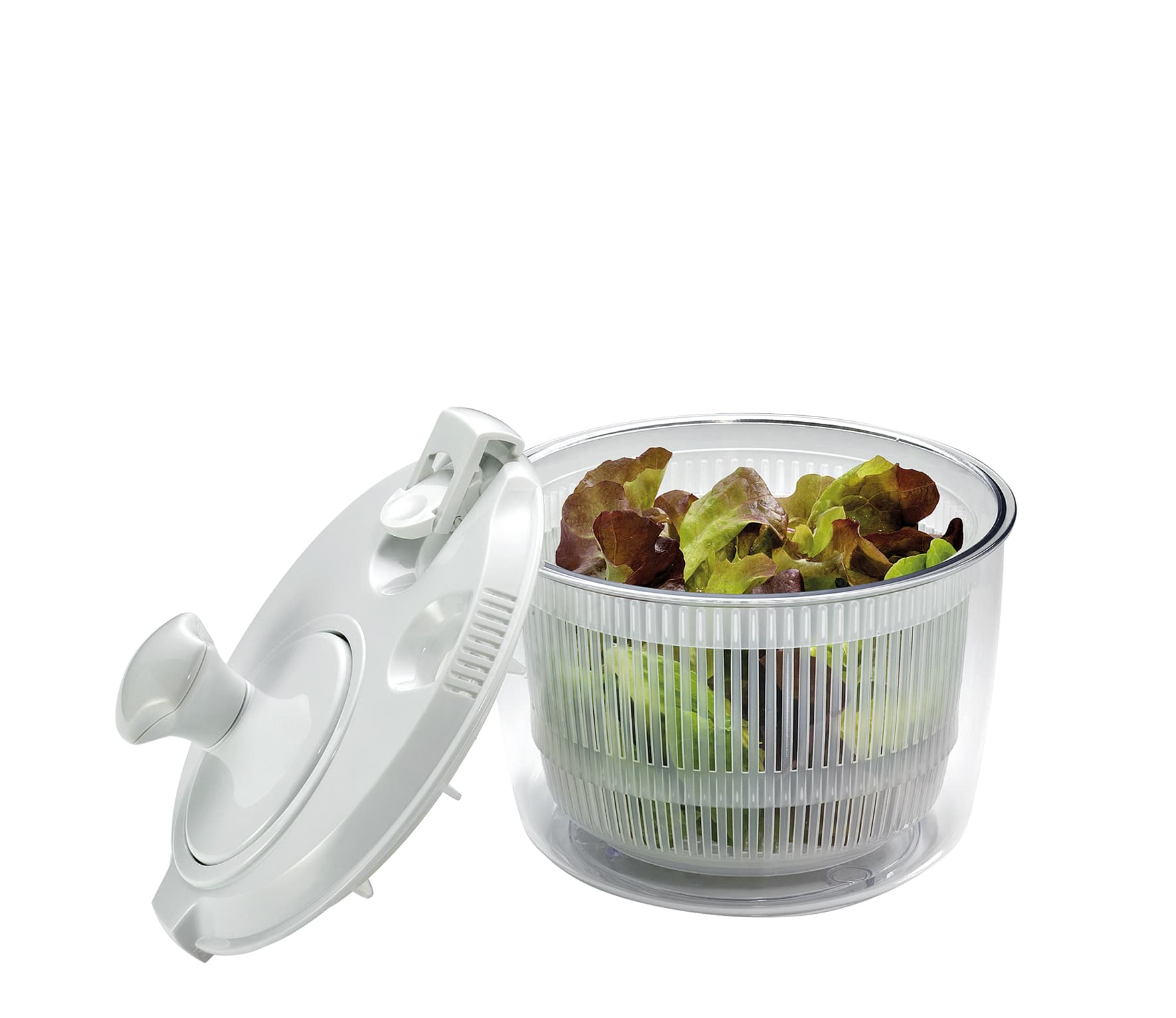 Salat ist gesund und schmeckt mit einem leckeren Dressing richtig gut. Wenn die Blätter nicht ausreichend abgetropft sind und die Vinaigrette verwässert, ist der Genuss allerdings getrübt. In der Mini-Salatschleuder von KÜCHENPROFI sind die Blätter im Nu trocken und bleiben knackig. Dank der praktischen Öffnung zum Einfüllen oder Abgießen von Wasser können Sie den Salat direkt in der Schüssel waschen. Das ist besonders praktisch bei stark sandigen Sorten wie Feldsalat. Setzen Sie einfach den Deckel auf und drehen Sie die leichtgängige Kurbel. Das Wasser fließt ab, der Rest bleibt im Sieb. Die Mini-Salatschleuder steht sicher auf ihrem rutschfesten Boden und kann als Salatschüssel direkt auf den Tisch. Auch zur Aufbewahrung von bereits gewaschenen Blättern oder Essensresten ist der Behälter aus hochwertigem Kunststoff geeignet. Der Deckel sitzt dank des zusätzlichen Verschlusses ganz fest und der Inhalt bleibt im Kühlschrank lange appetitlich.