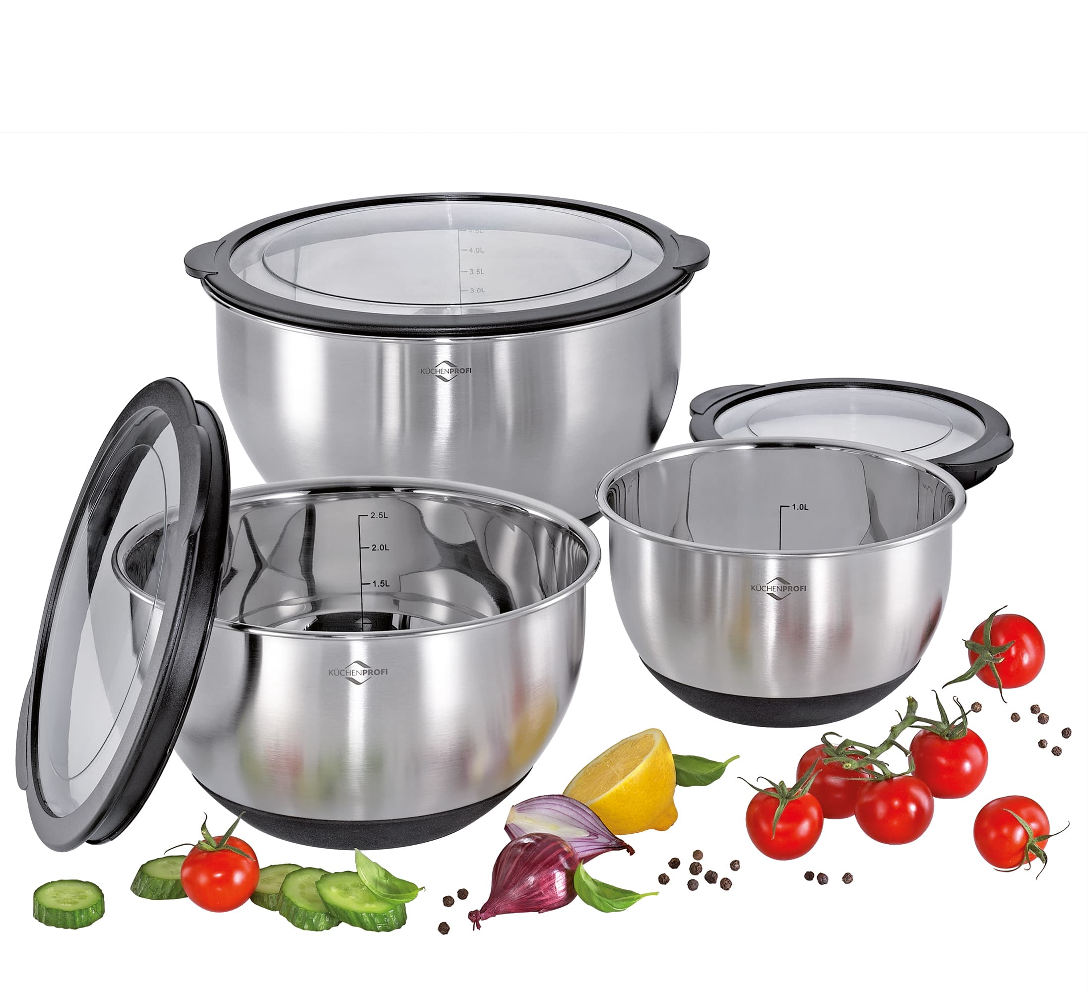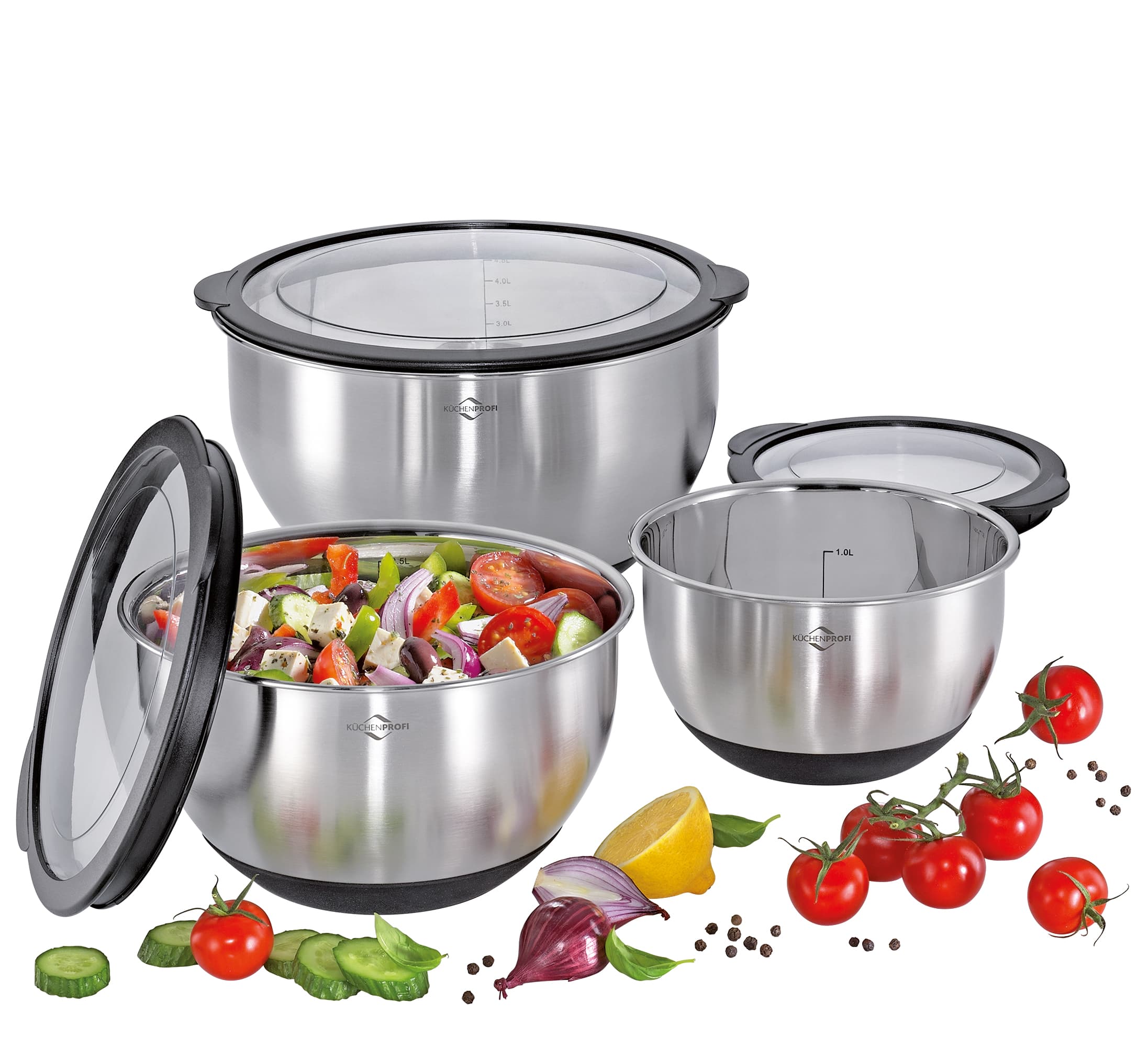 Von Frühstücksflocken bis Mitternachtssnack. Die KÜCHENPROFI Schüssel DELUXE begleitet Sie durch den Tag. Der Behälter aus robustem Edelstahl ist perfekt zum Zubereiten, Servieren, Aufbewahren und Mitnehmen von Speisen. Dank des transparenten, luftdichten Deckels bleiben Salate, die Meal-Prep-Portion, geschnittenes Obst- oder Gemüse und Speisereste frisch. So vermeiden Sie, dass Lebensmittel in der Tonne landen. Auch für den Transport von Speisen zur Arbeit, zum Sommerfest oder Picknick ist die vielseitige Schüssel bestens geeignet.