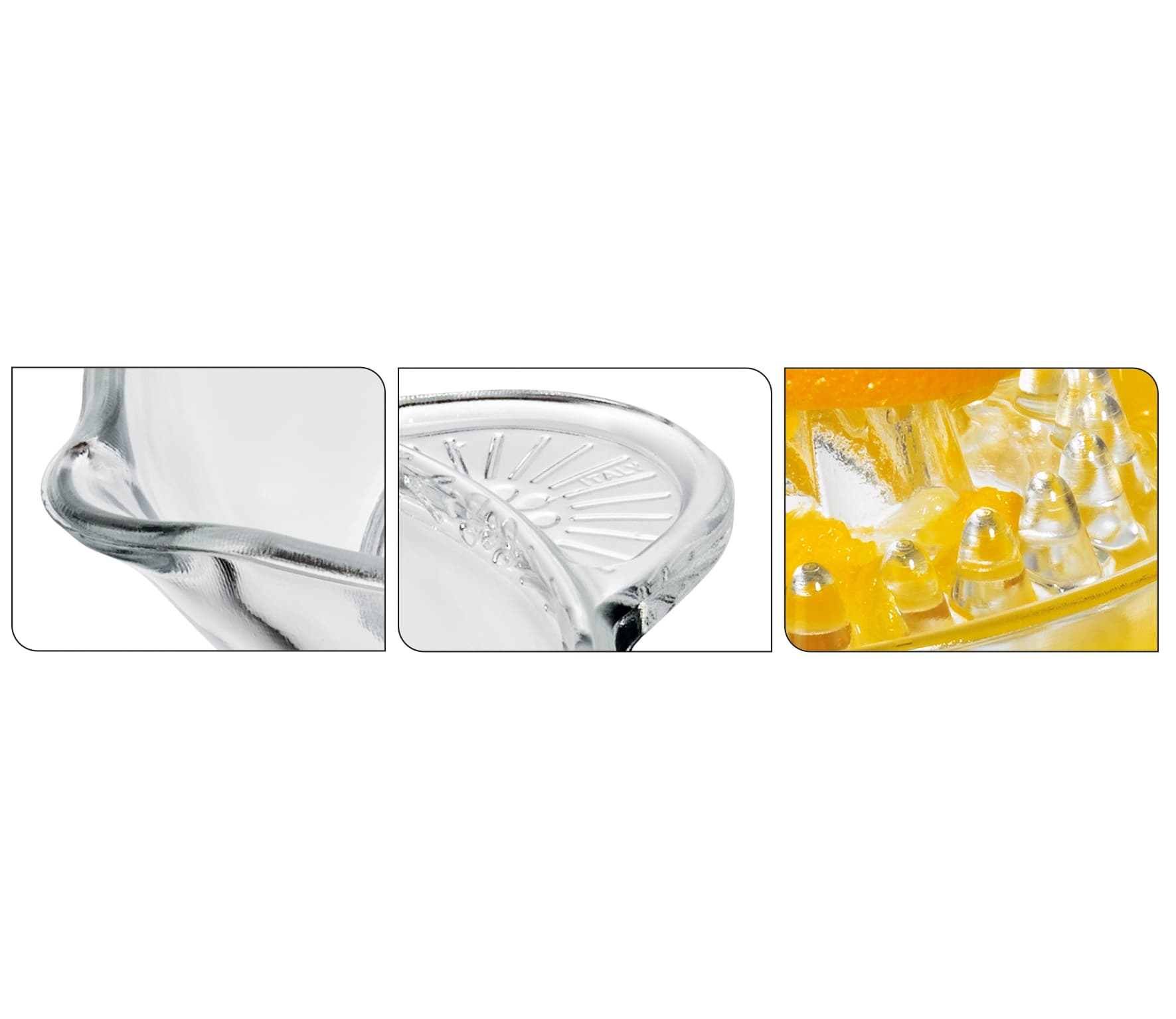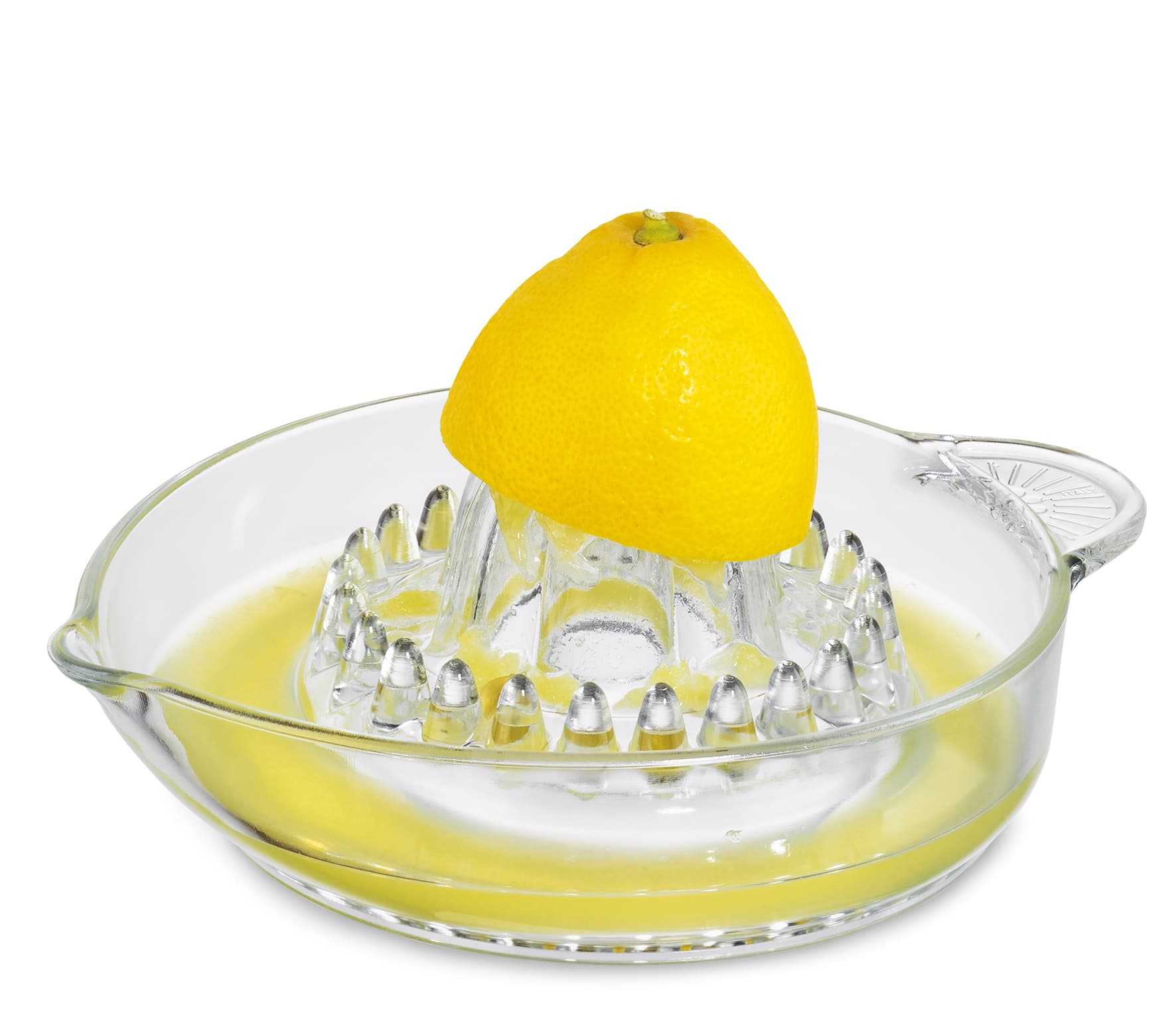 Kleiner Spritzer, große Wirkung. Zitronensaft verhindert, dass die Früchte im Obstsalat braun werden, rundet den Risotto mit Spinat und Ricotta ab und macht den Kastenkuchen herrlich saftig. Mit der Zitruspresse aus Glas von KÜCHENPROFI gelangen Sie mühelos an den Saft der aromatischen Früchte, Kerne und Fruchtfleisch werden zurückgehalten. Die Presse aus Glas holt auch aus Orangen und Grapefruits das Beste heraus. Der Küchenhelfer für den täglichen Einsatz hat einen praktischen Ausgießer und einen Griff. Übrigens: Zitronensaft, der nicht sofort verbraucht wird, lässt sich prima im Eiswürfelbereiter einfrieren. Ein Highlight für selbstgemachte Limonaden oder die Wasser-Karaffe!