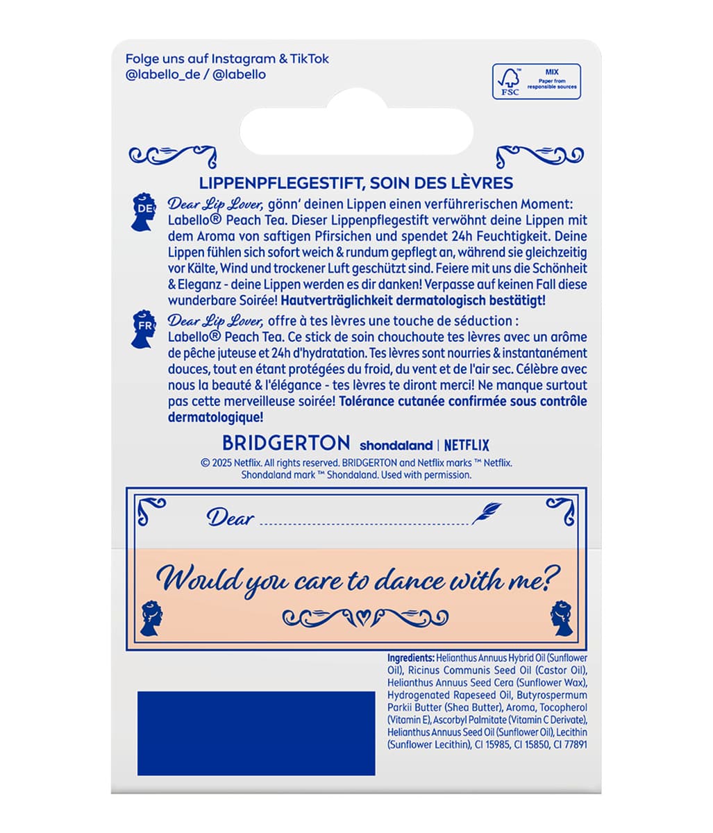 | Anwendungshinweis | Der Lippenpflegestift kann je nach Bedarf mehrmals täglich angewendet werden. Labello Peach Tea sanft auf die Lippen auftragen für intensive Pflege und einen Hauch Farbe. |